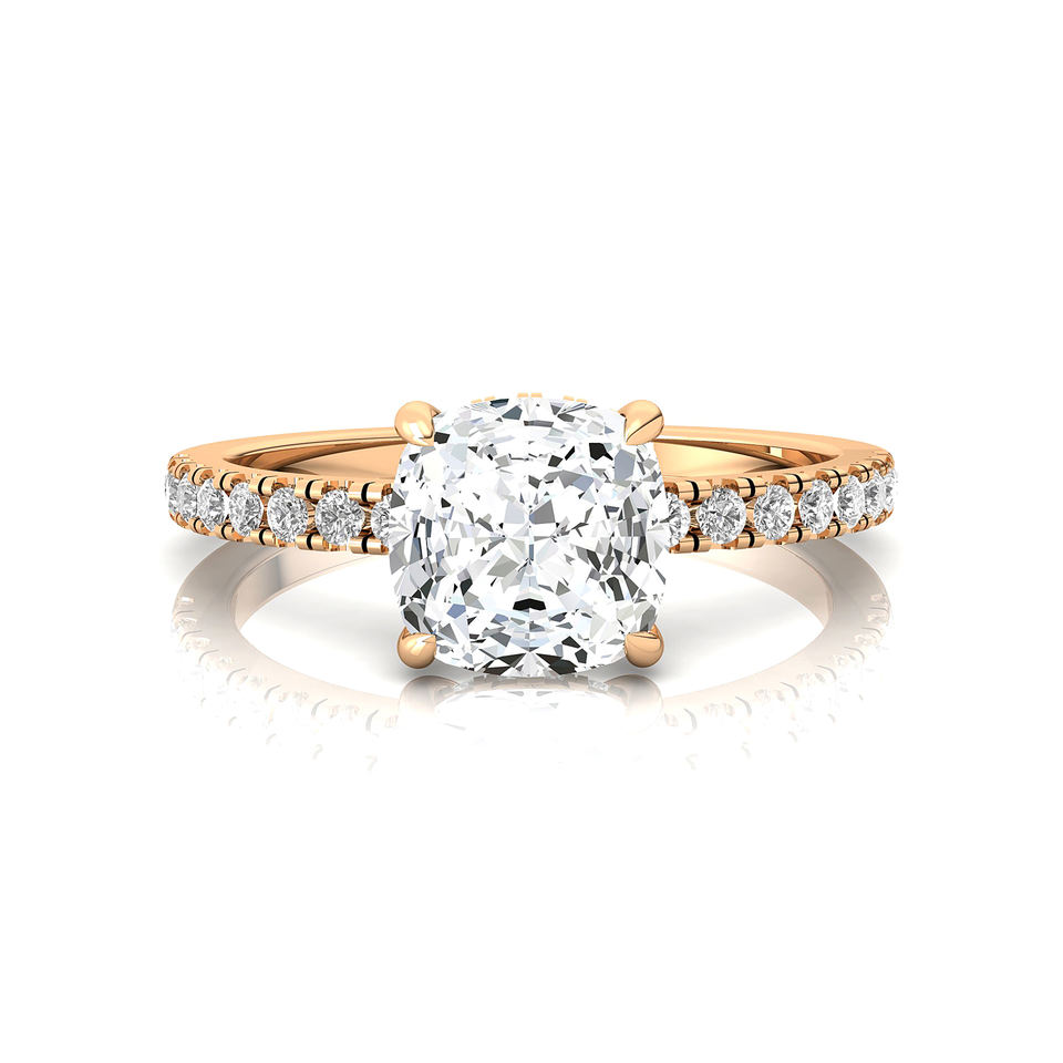 Custom Made 14K Gold Prong Set Cushion Cut 1-4 Carat Lab Grown Diamond Solitaire Engagement Ring With Pave Accent Diamond Band