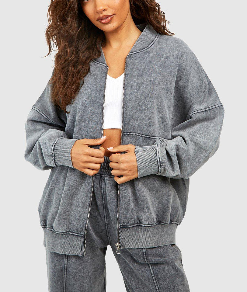 Ensemble de survêtement décontracté pour femme, sur mesure, respirant, imprimé, délavé à l'acide, à capuche, 2 pièces, surdimensionné, fermeture éclair, jogging