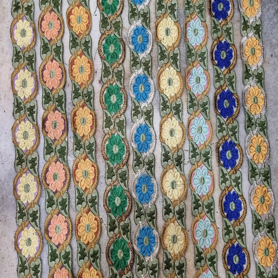 Garnitures de dentelle brodées sur mesure en motifs floraux en couleurs or métallique ou fils d'argent pour une tenue traditionnelle ou festive.