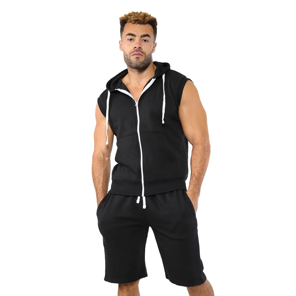 Custom Made Mens Black Sleeveless Hoodies and Shorts Set Cotton Fleece Full Zipper Stylish Casual Wear Summer Tracksuit Set
