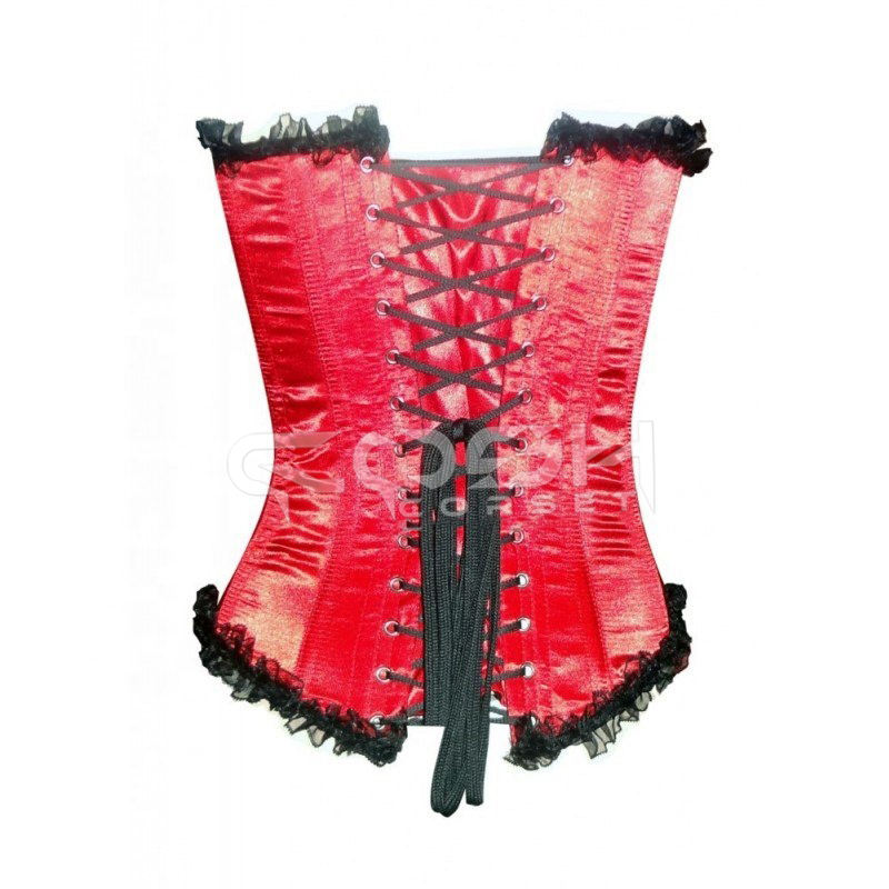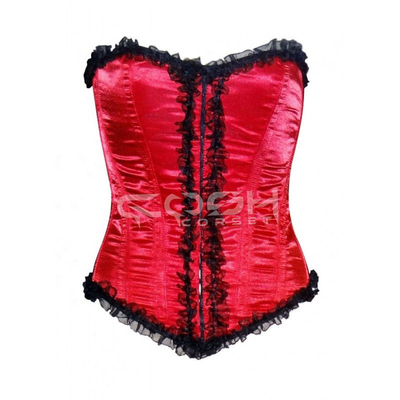 Corset sur mesure en satin rouge avec baleines en acier et volants noirs