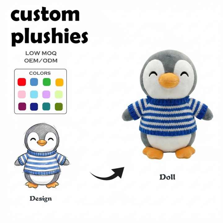Peluches personnalisées avec logo, fabricant de jouets en peluche, pingouin personnalisé en peluche avec pull rayé, animal en peluche, poupée en peluche