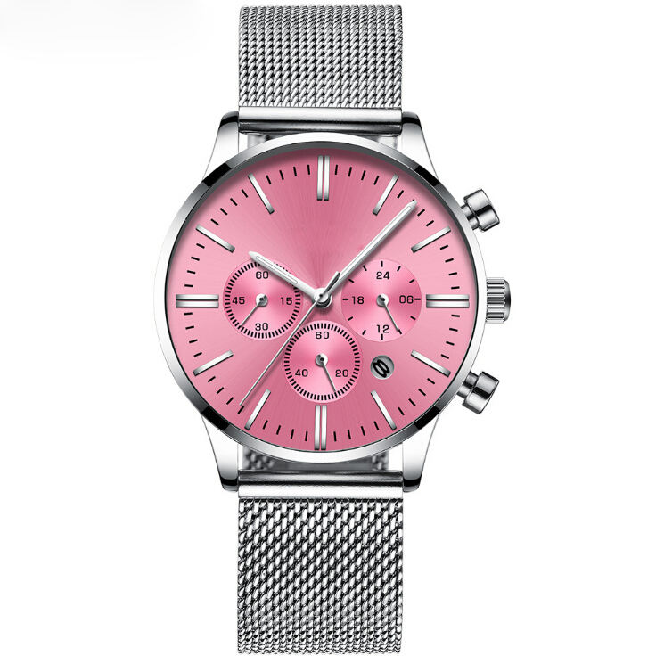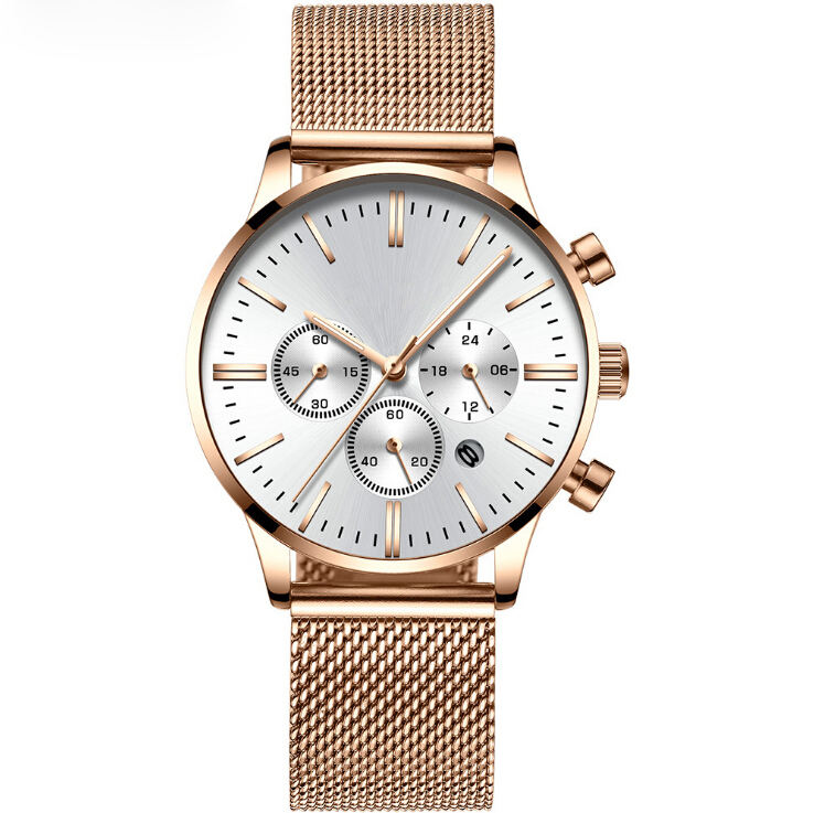 Montre-bracelet sur mesure en acier inoxydable à quartz doré et fin pour hommes d'affaires Chrono Sport avec bracelet en maille de cuir cadran en verre fenêtre