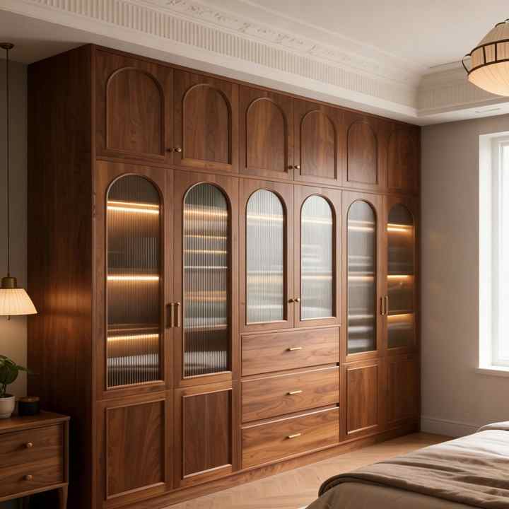 Armoire autoportante en bois sur mesure, style moderne, portes en verre à nervures en arc, résistante à l'humidité, armoire de chambre durable