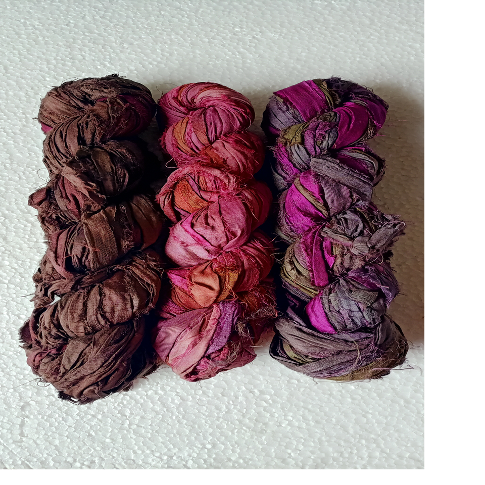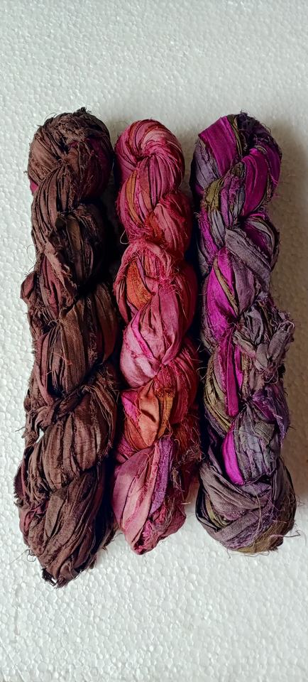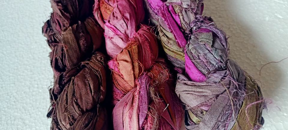 Ruban de soie recyclée teint en soie sari fabriqué sur mesure dans des couleurs uniques pour des projets d'art et d'artisanat