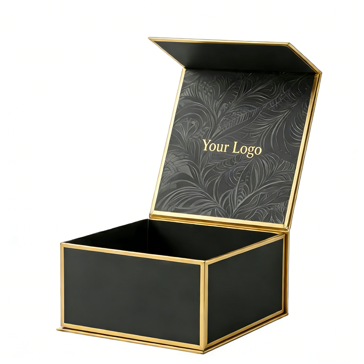 Boîte à parfum magnétique personnalisée à rabat, noire, imprimée avec estampage à chaud doré, en carton rigide, emballage cosmétique, boîte cadeau