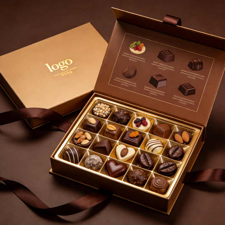 Ruban de célébration de luxe à impression magnétique personnalisée avec plateau de présentation en plastique doré, boîtes de bonbons au chocolat à la fraise