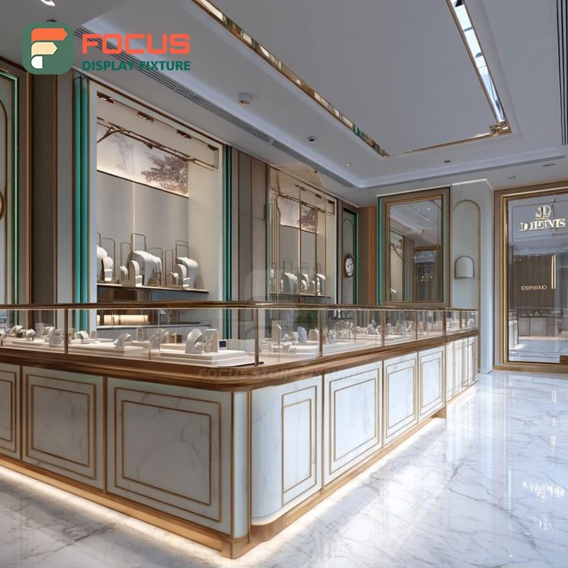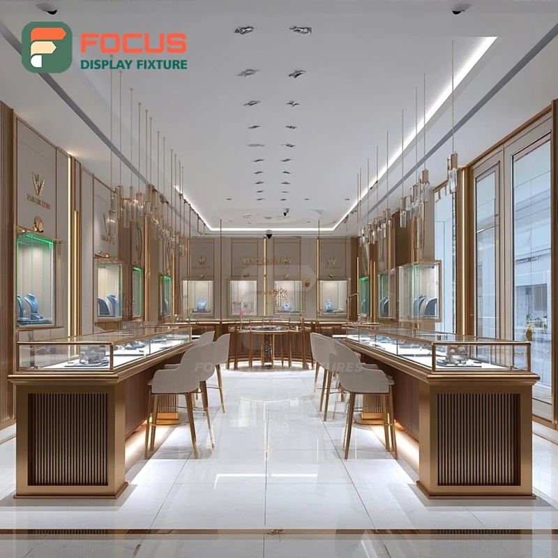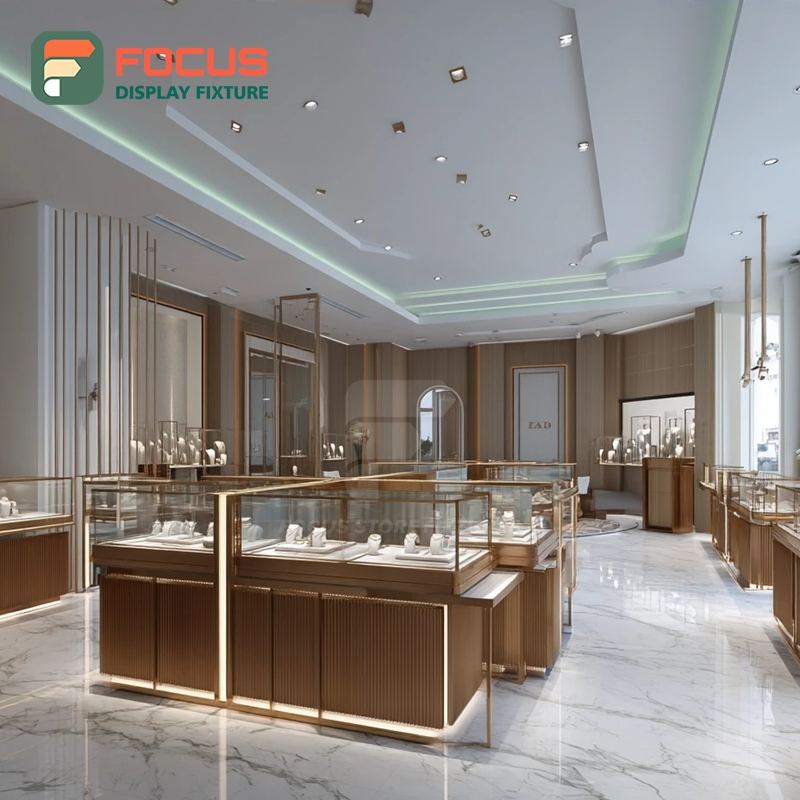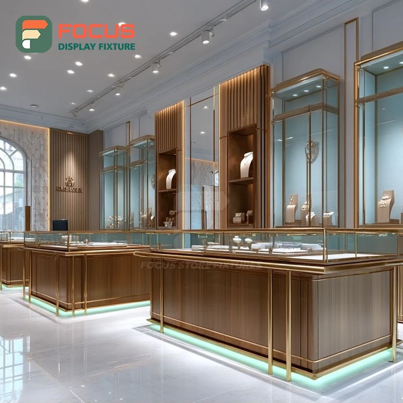 Meubles de magasin de bijoux sur mesure, cadre en bois, espace boutique, vitrine en verre