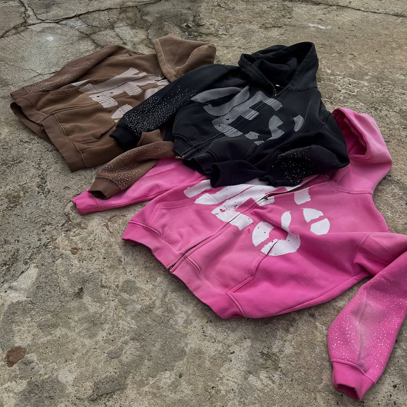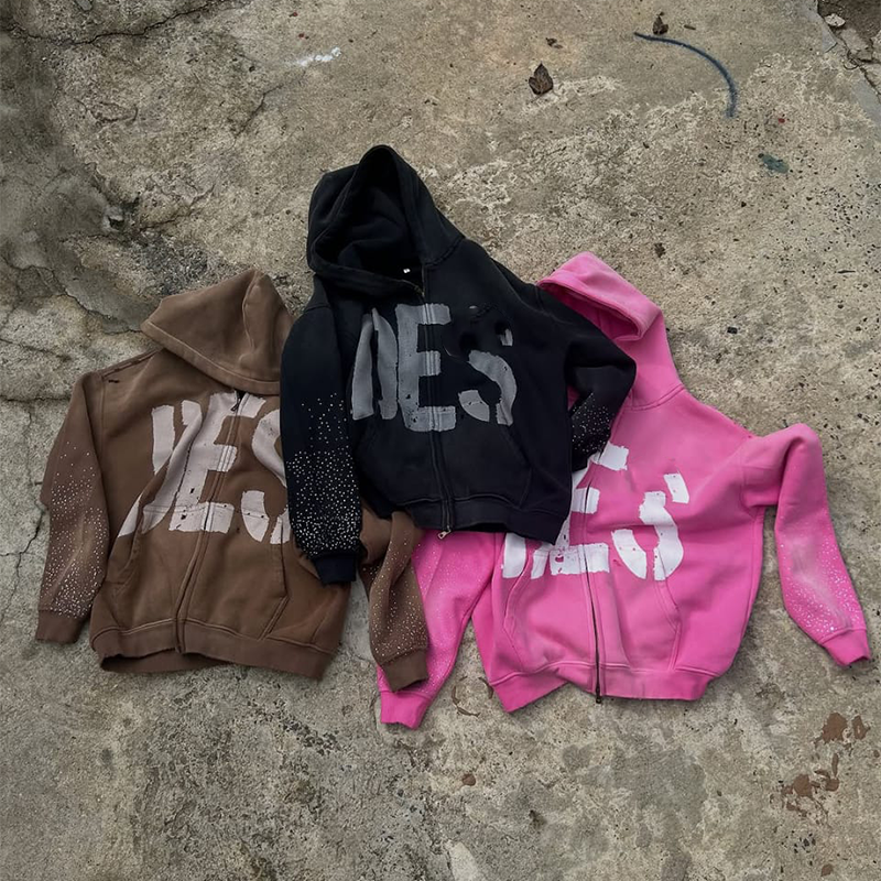 Sweat à capuche vieilli avec broderie du fabricant personnalisé veste zippée en strass sweat à capuche Streetwear en polaire délavé vintage pour hommes délavés au soleil