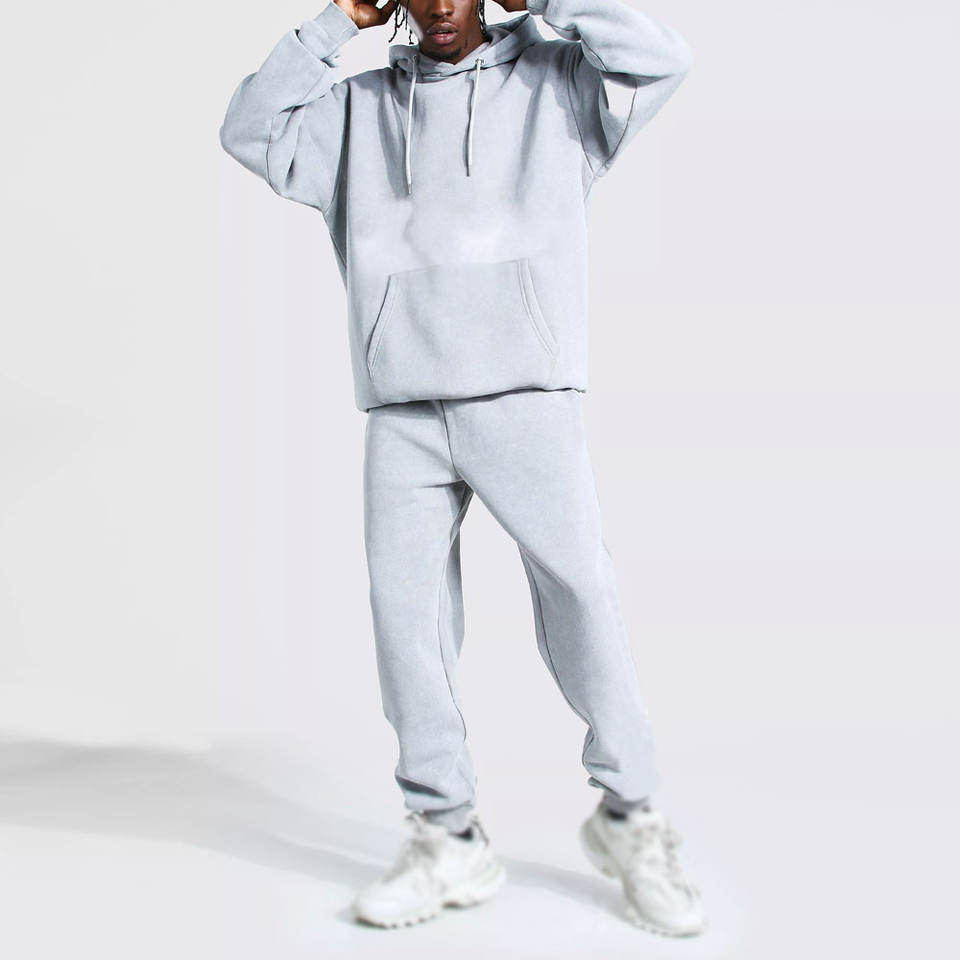 Ensemble survêtement homme streetwear personnalisé avec strass, sweat à capuche zippé et pantalon de survêtement, délavage acide et effet délavé soleil 2026