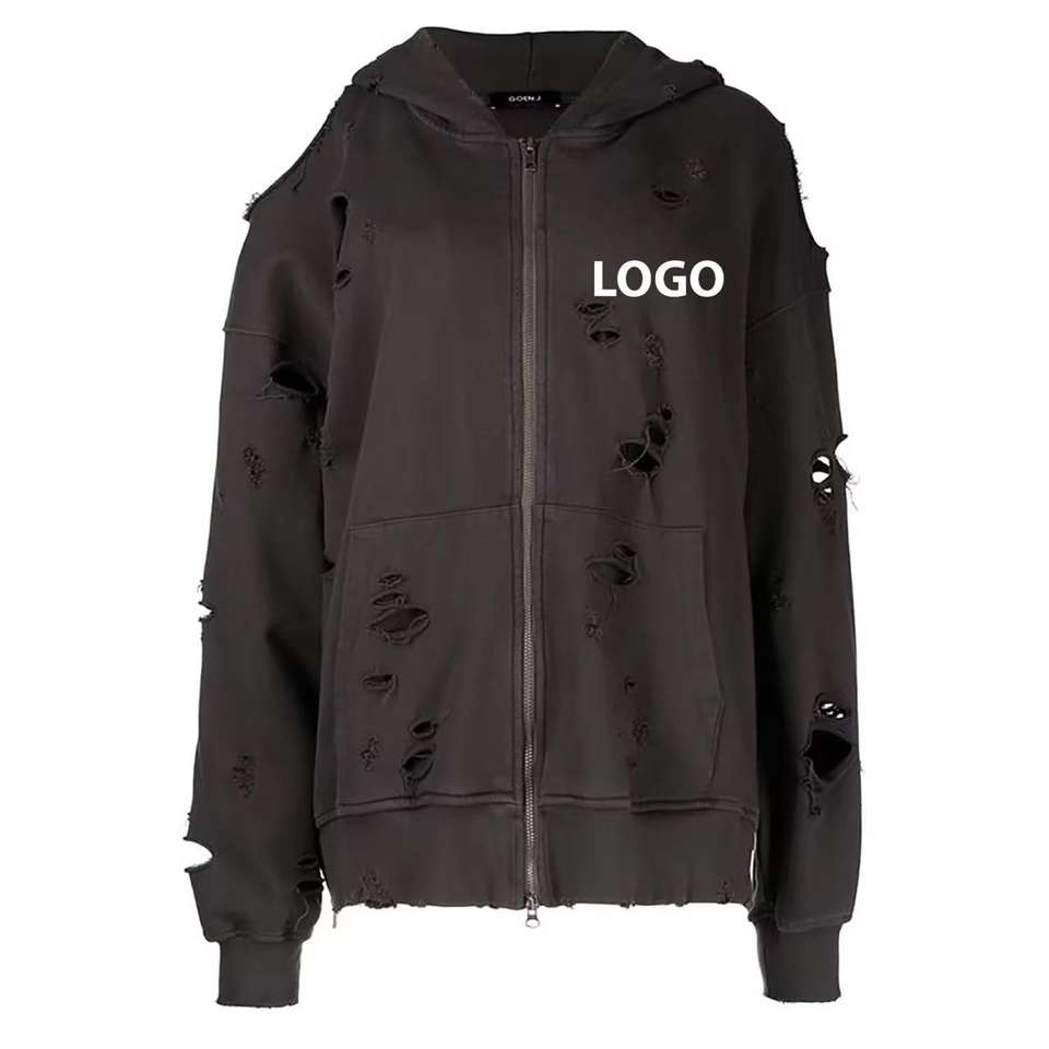 Sweat à capuche oversize à manches longues avec effet délavé et strass, fabriqué sur mesure, pour homme, lavage à l'acide, fermeture éclair