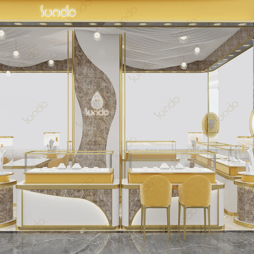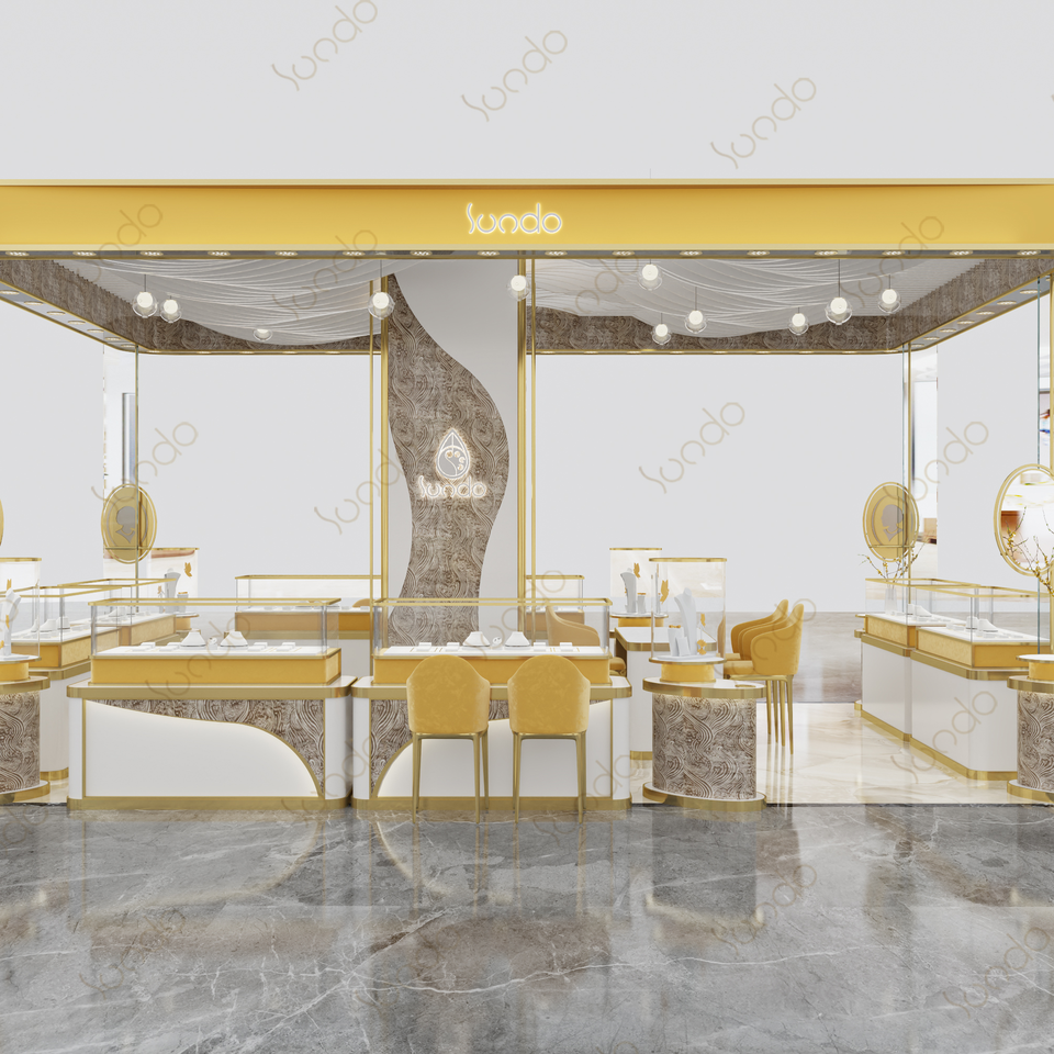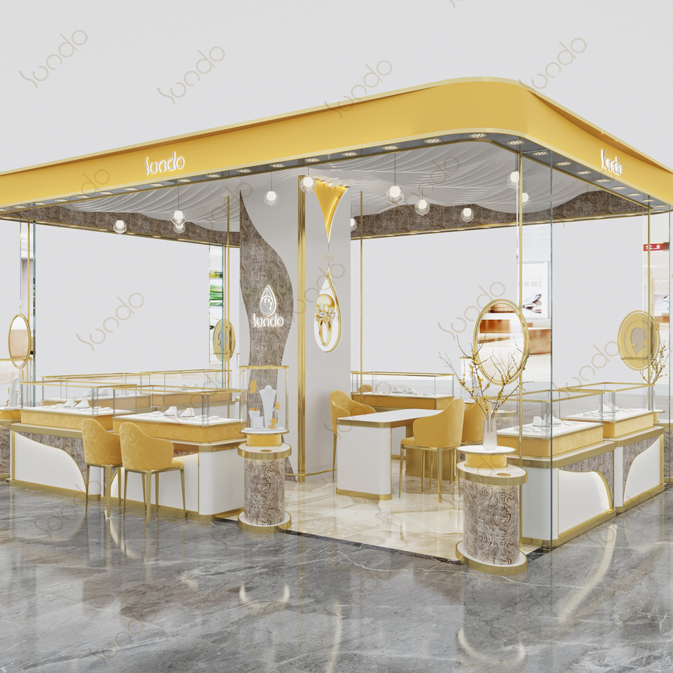 Stand d'exposition sur mesure pour fabricant, design unique de kiosque à bijoux en or de petite taille, design de vitrine à bijoux