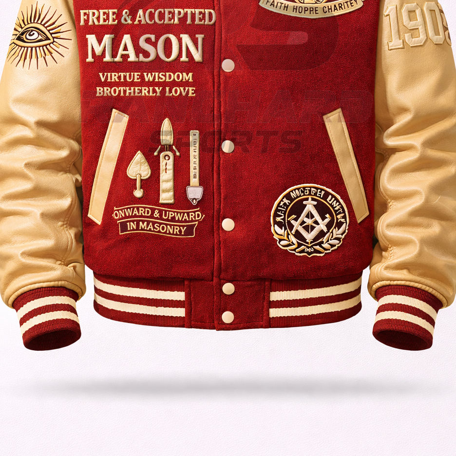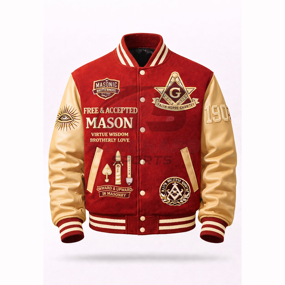 Veste universitaire personnalisée d'inspiration maçonnique – Corps en laine de qualité supérieure avec manches en cuir PU et symboles brodés