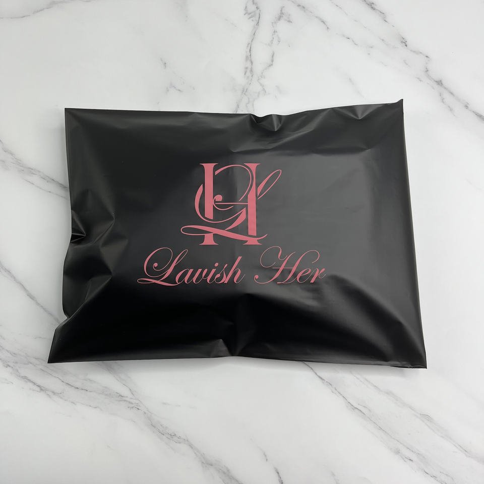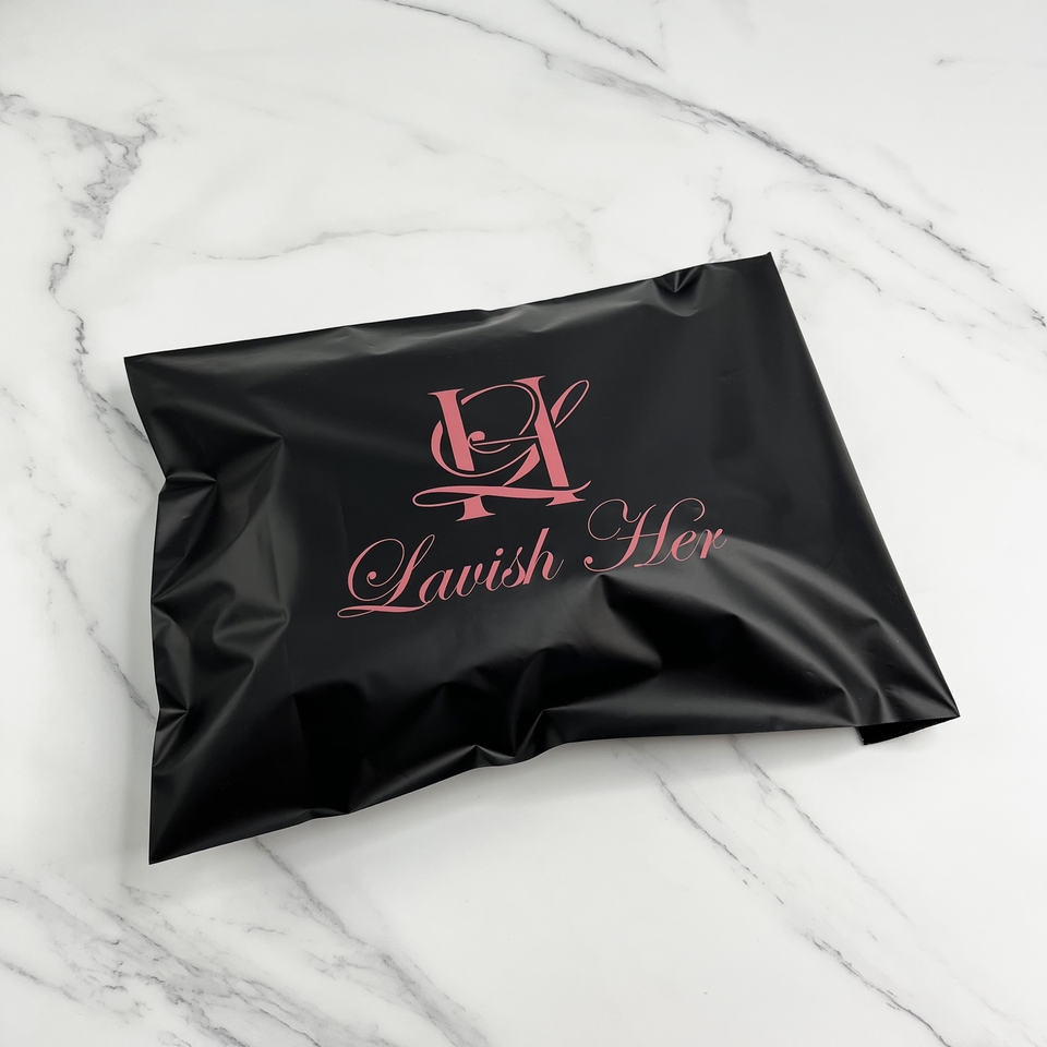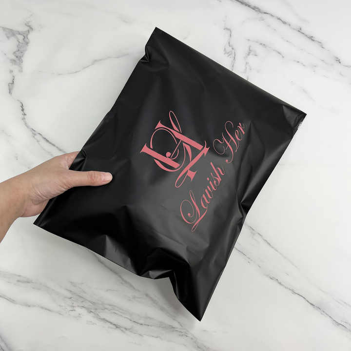 Enveloppes en polyéthylène noir mat personnalisées avec impression rose - Sacs d'expédition de marque pour les marques de beauté et de mode