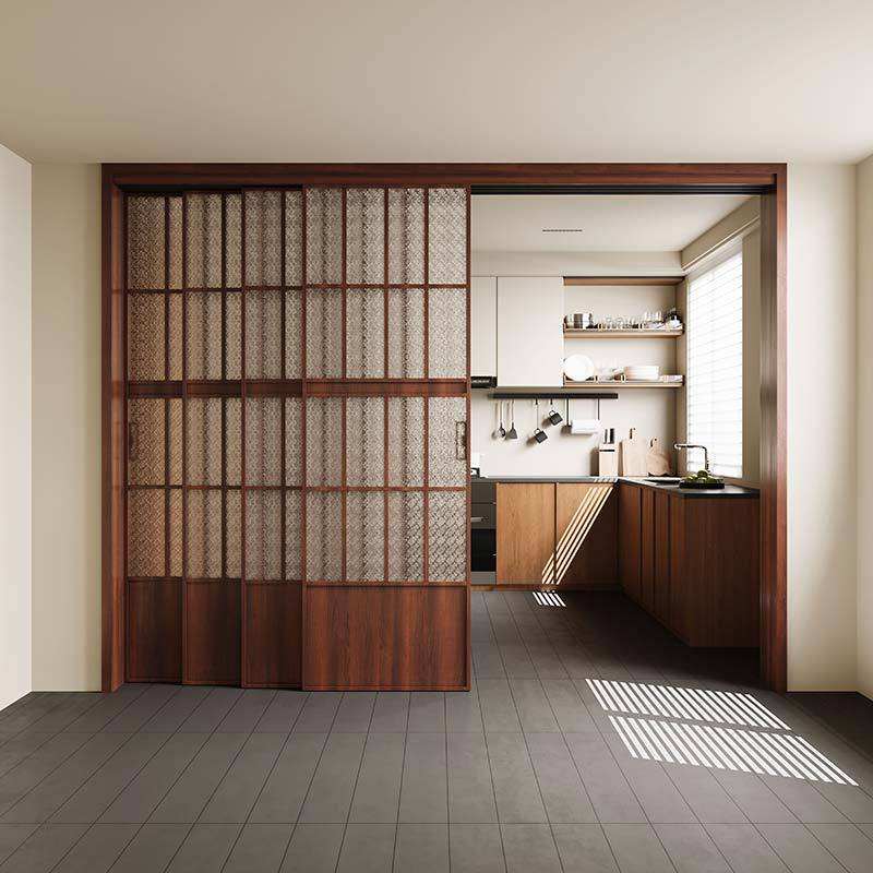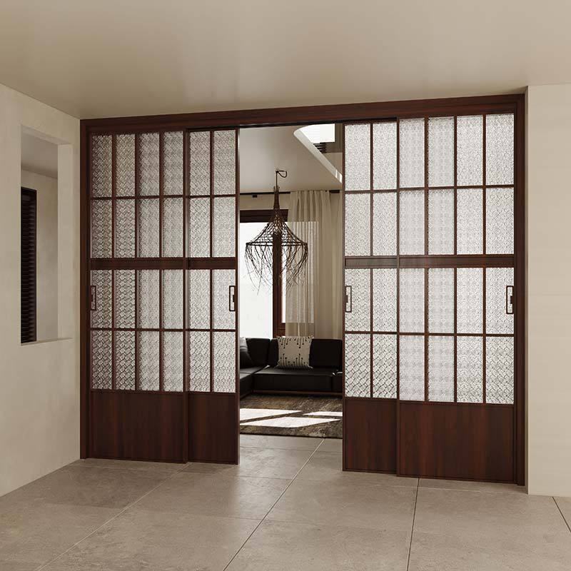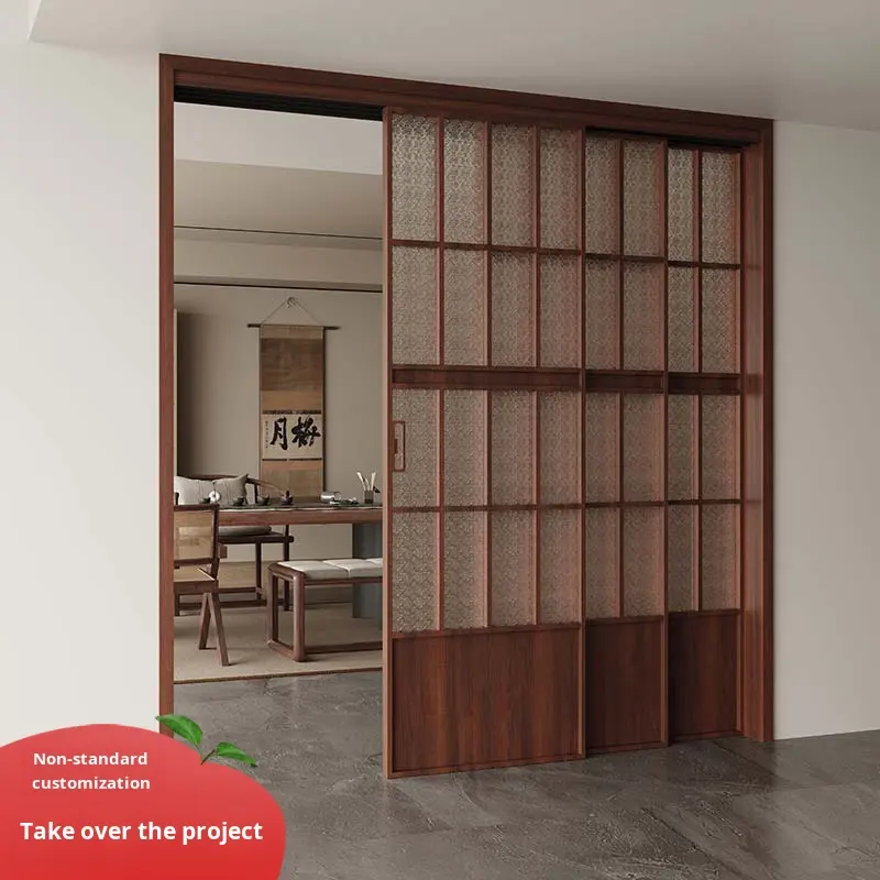 Porte coulissante rétro en bois de noyer de style médiéval personnalisé tringlerie à trois voies pour cuisine salon cloison rail de plafond rail de sol