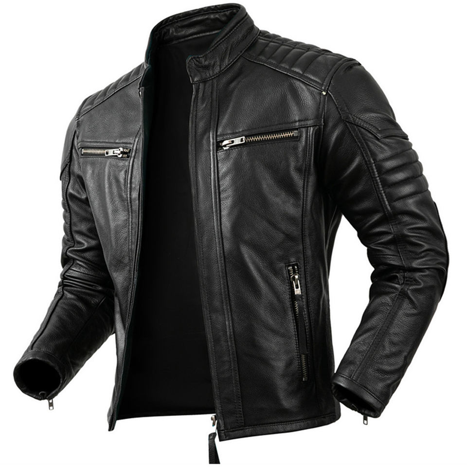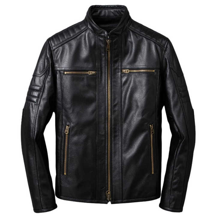 Veste en cuir noir pour homme sur mesure, fermeture éclair bronze, style Cafe Racer, veste de motard, épaulettes rembourrées, coupe ajustée, cuir véritable OEM