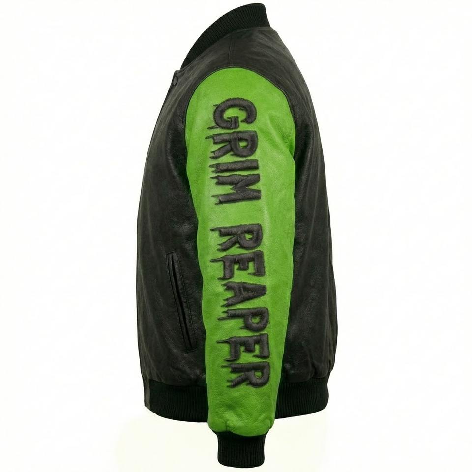 Veste d'hiver personnalisée pour homme, col mandarin, en cuir véritable noir et vert, coupe-vent, avec broderie tête de mort Grim Reaper, style streetwear