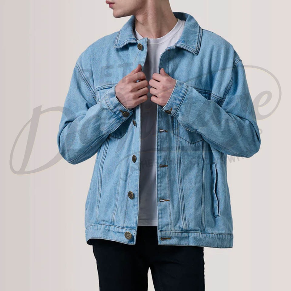 Veste en jean bleu clair sur mesure pour homme, coupe oversize, délavage vintage, en coton, style streetwear décontracté, manteau ample