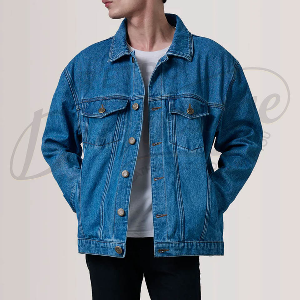 Veste en jean bleu moyen sur mesure pour homme, coupe ample et oversize, délavage vintage, en coton, style streetwear décontracté