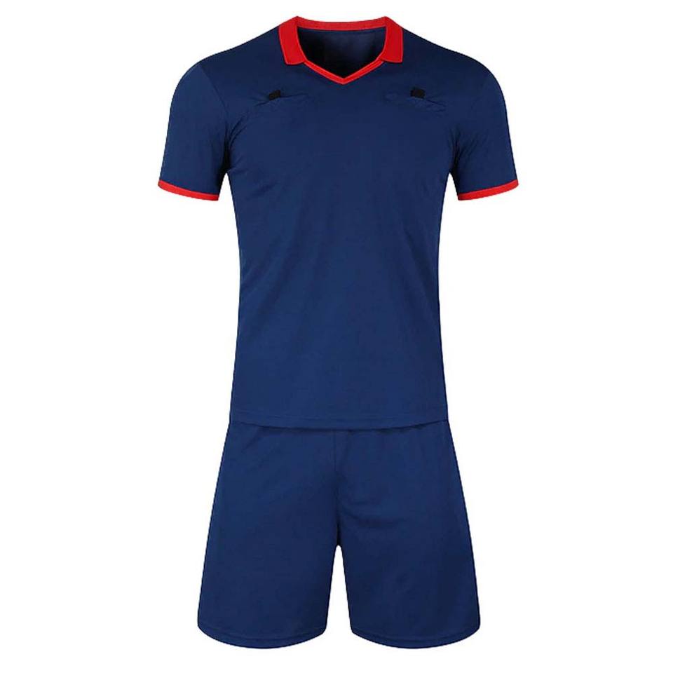 Tenue de football personnalisée pour hommes, maillot de football bleu marine, ensemble de maillot de football avec bordure rouge contrastée, kit d'entraînement, vente en gros d'usine, OEM, vêtements en vrac