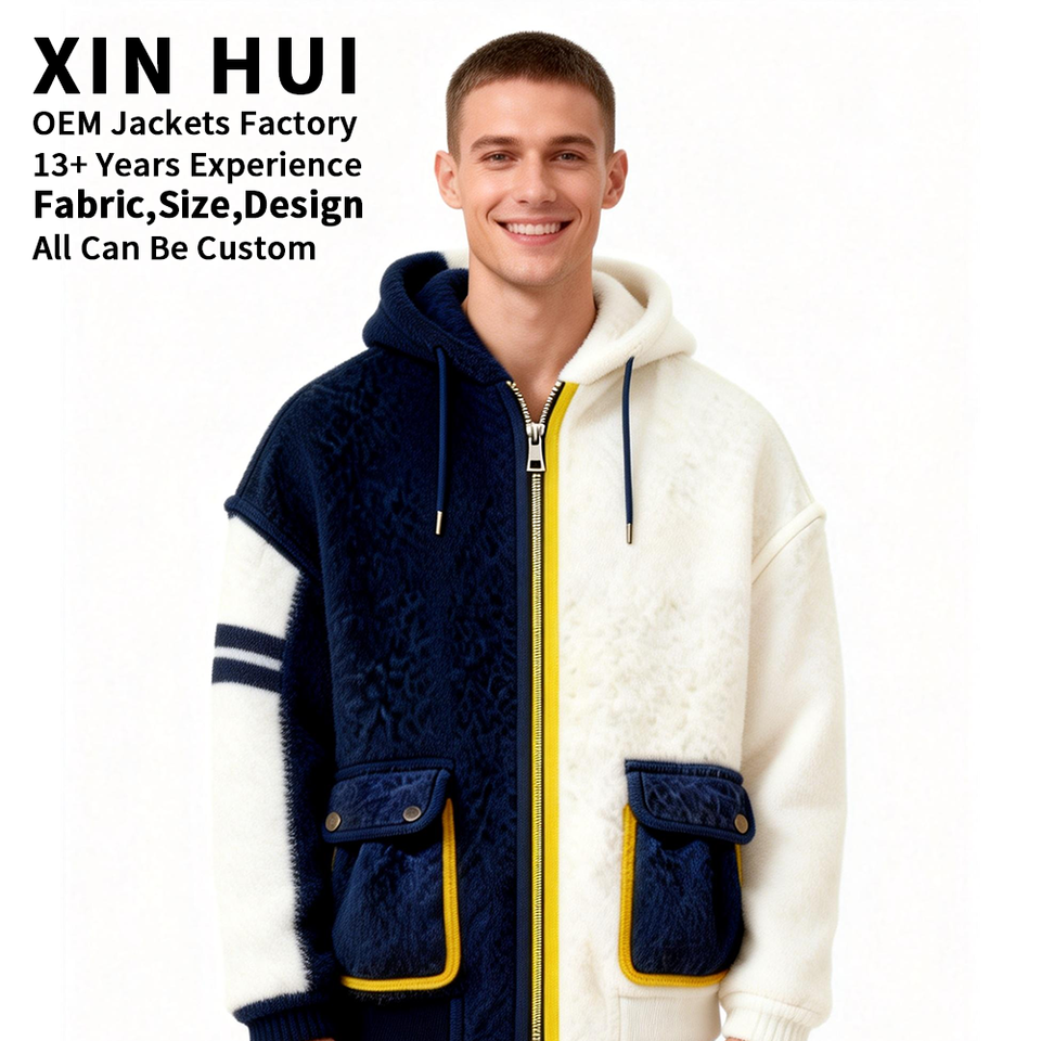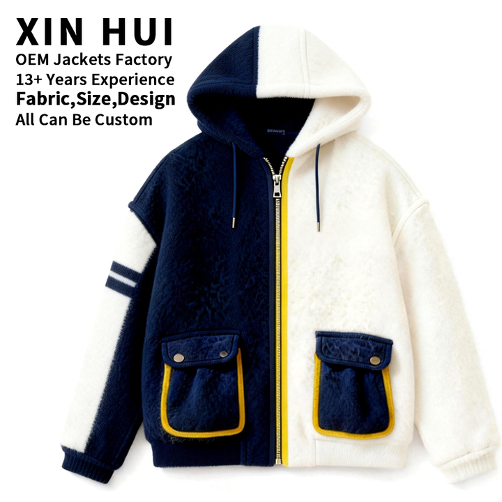 Veste à capuche unisexe personnalisée en polaire Sherpa, longue, d'hiver, color block, avec patchwork contrastant, épaisse, chaude, zippée, style Teddy Streetwear
