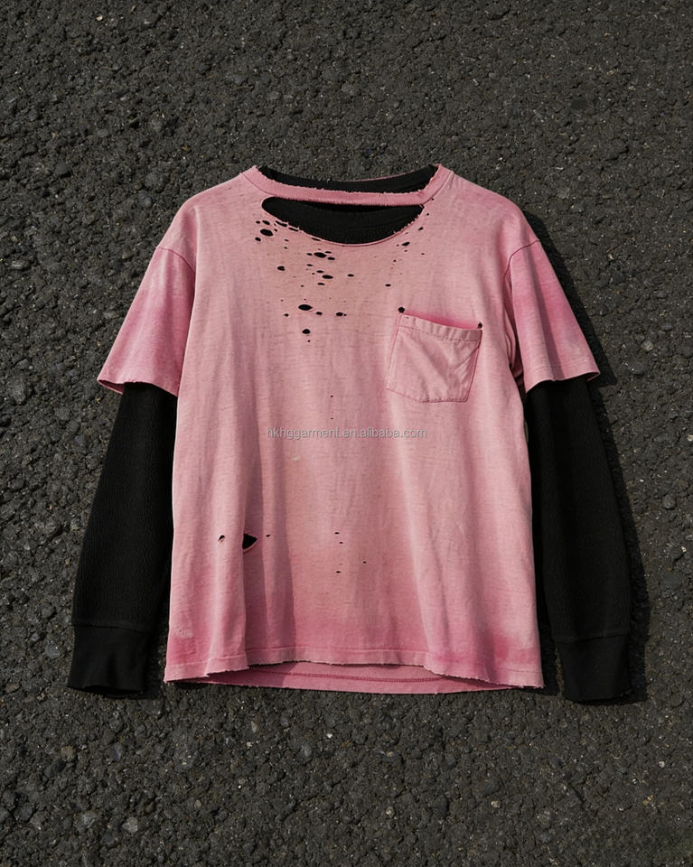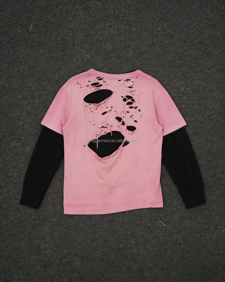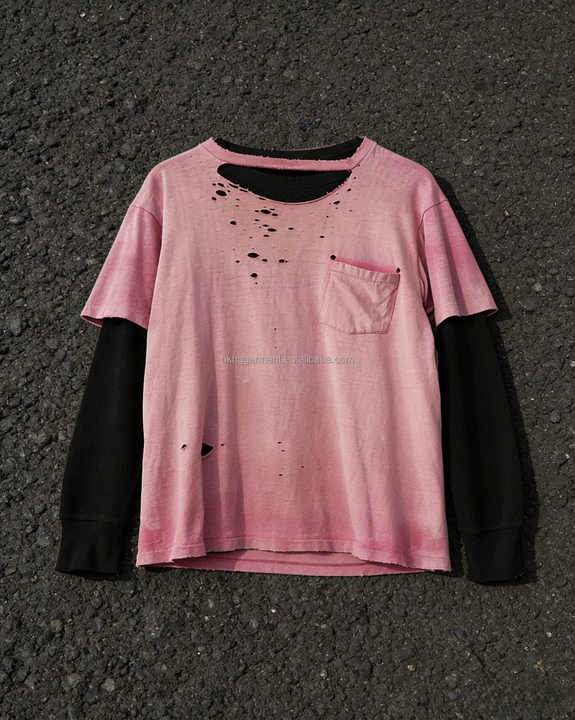 T-shirt personnalisé pour homme, rose délavé, effet usé, à manches longues, avec couches superposées et déchirées