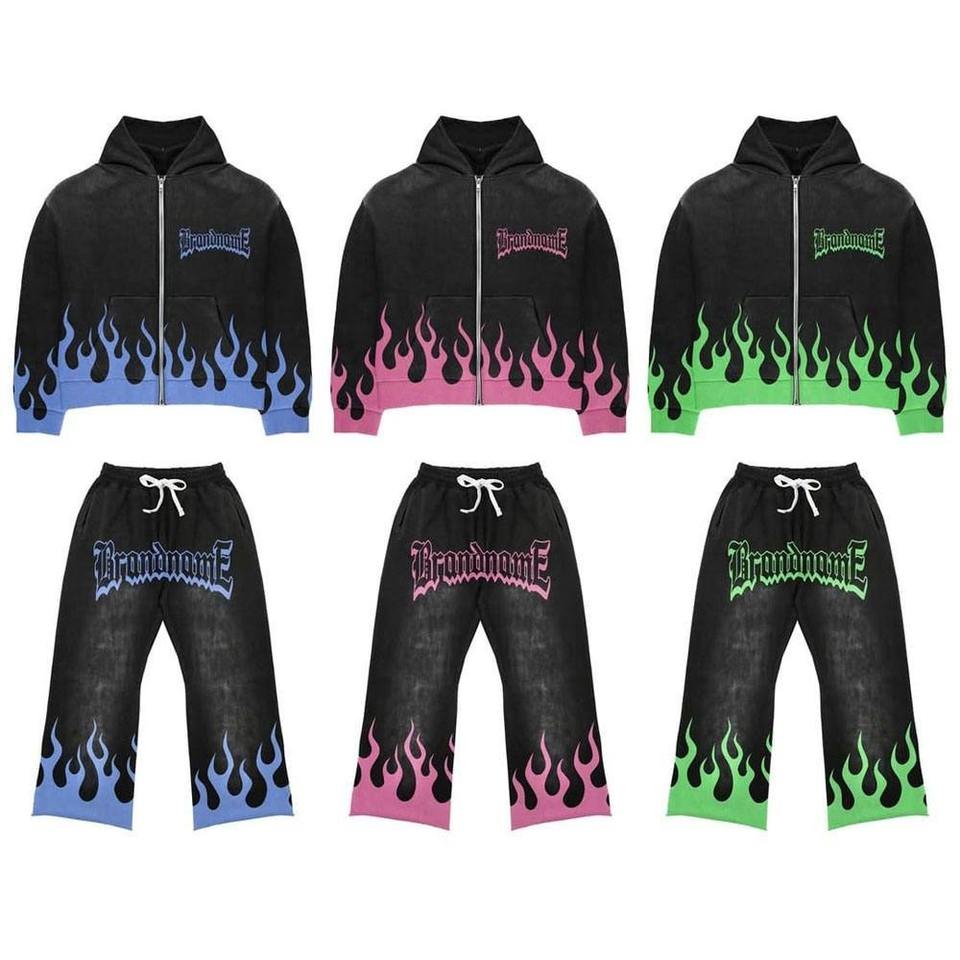 Sweat à capuche zippé surdimensionné pour homme, coupe ample, délavé à l'acide, tissu lourd avec imprimé flamme délavé, style hip-hop