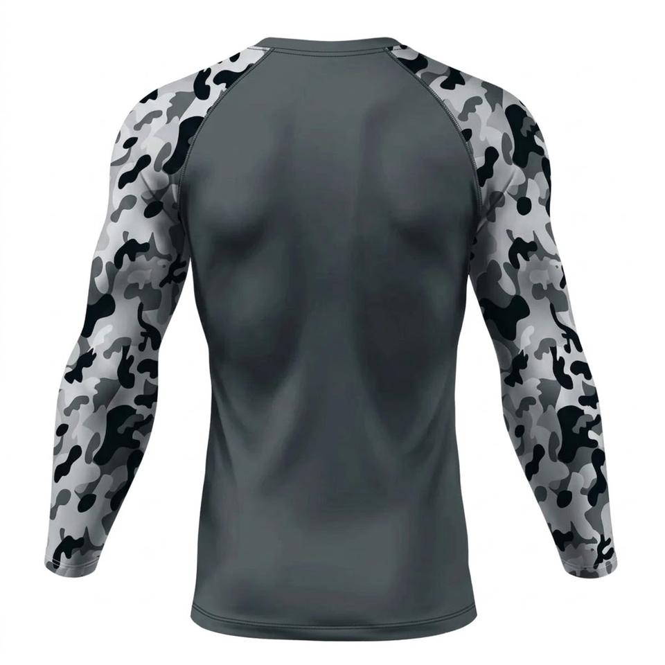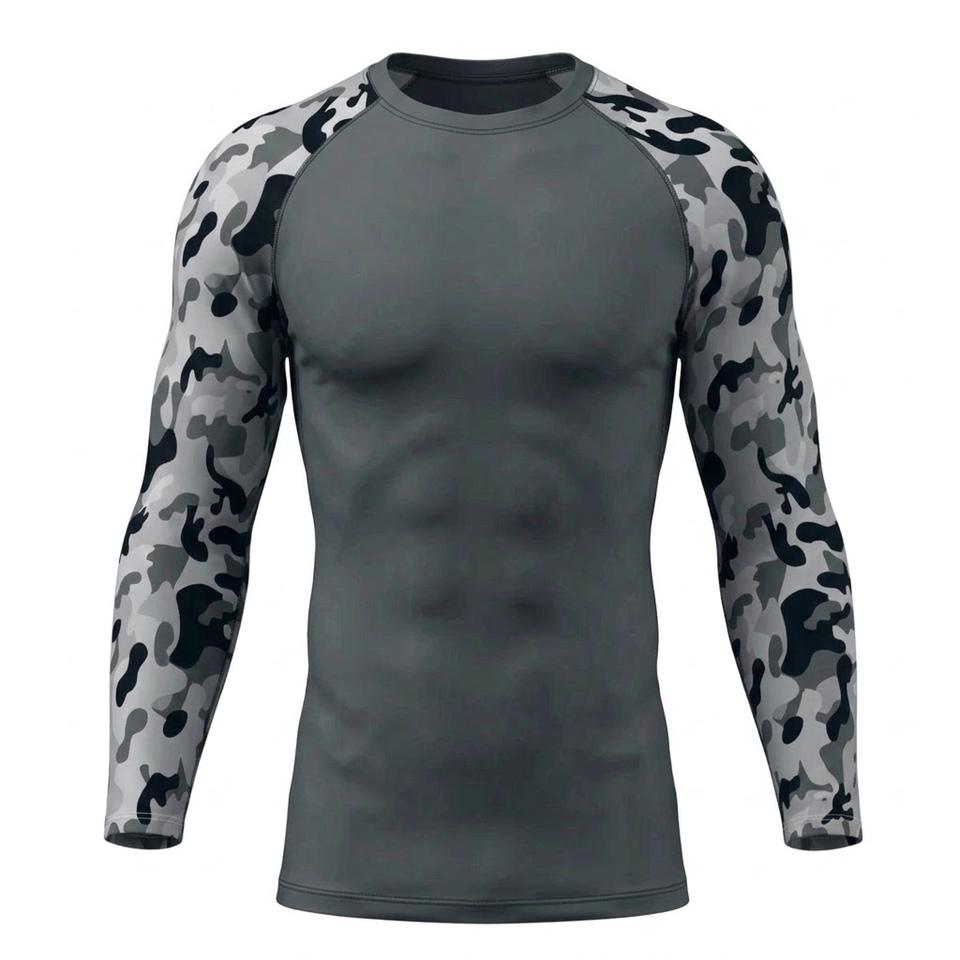 Haut de compression tactique gris à manches longues pour homme, motif camouflage, pour MMA, BJJ, grappling, respirant, pour l'entraînement de combat