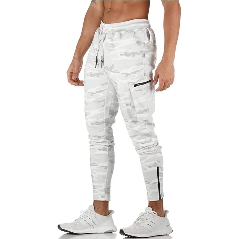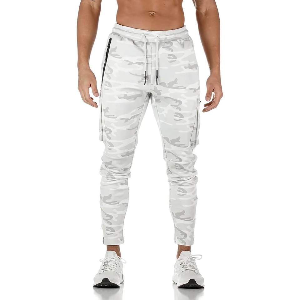 Pantalon de survêtement cargo personnalisé pour homme, motif camouflage blanc, avec poches zippées, respirant, idéal pour la gym et l'entraînement