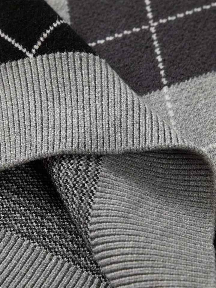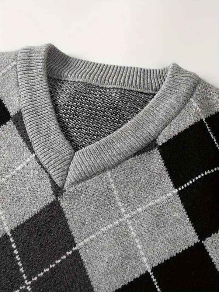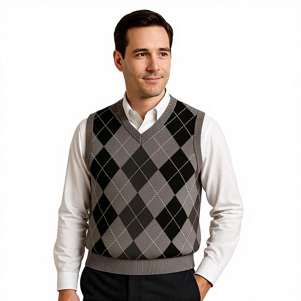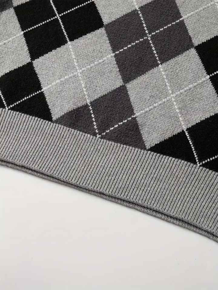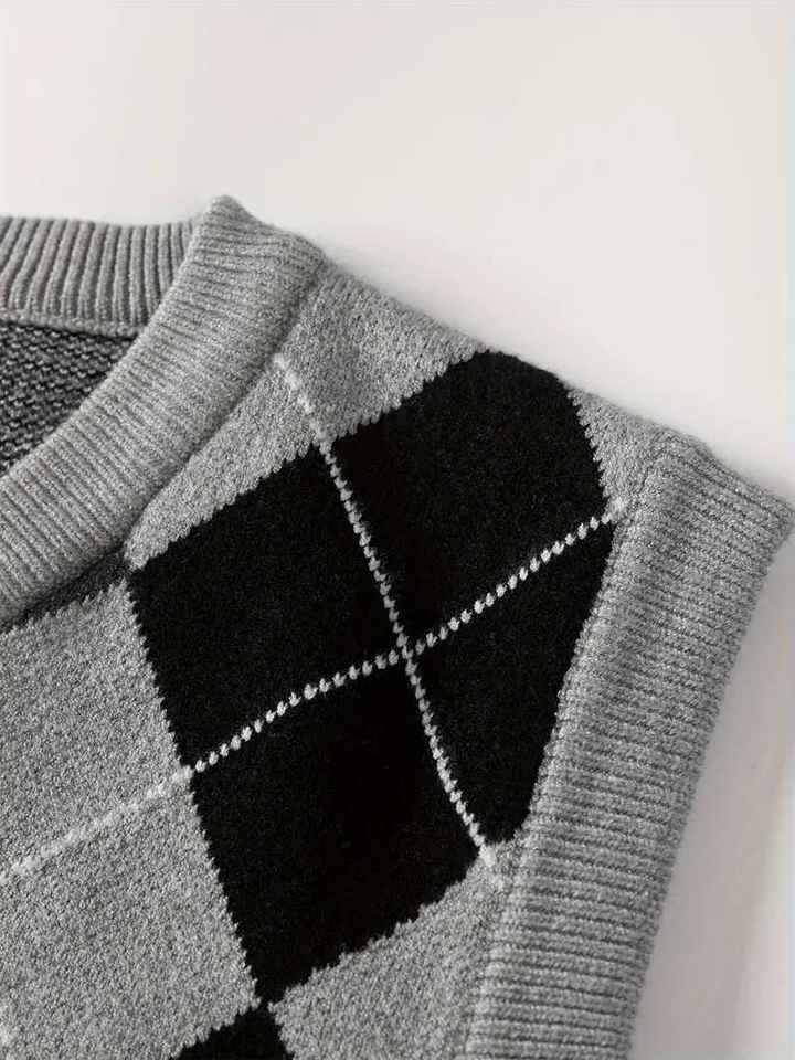 Gilet tricoté personnalisé pour homme grande taille, style rétro preppy, col en V, sans manches, motif argyle color block, idéal pour le golf
