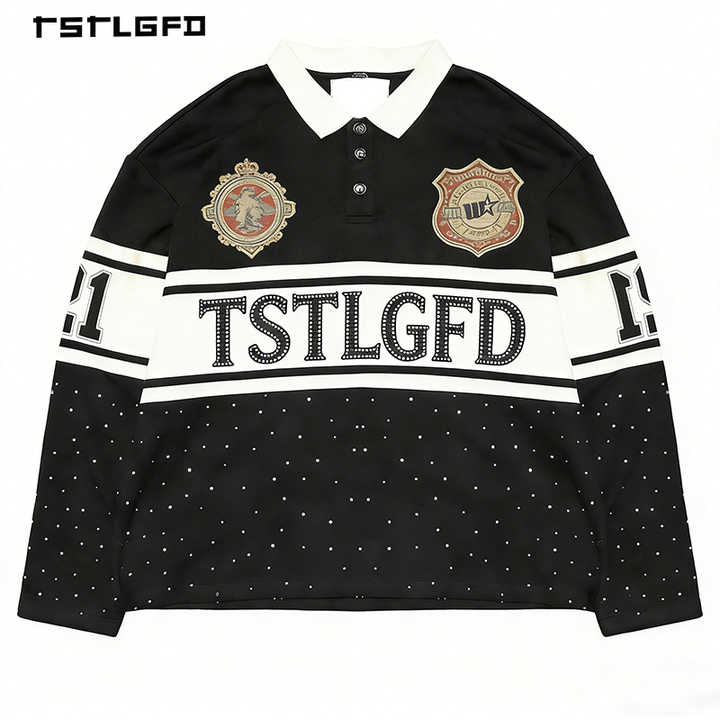 T-shirt personnalisé pour homme, broderie délavée, 100% coton, strass, coupe ample, manches longues