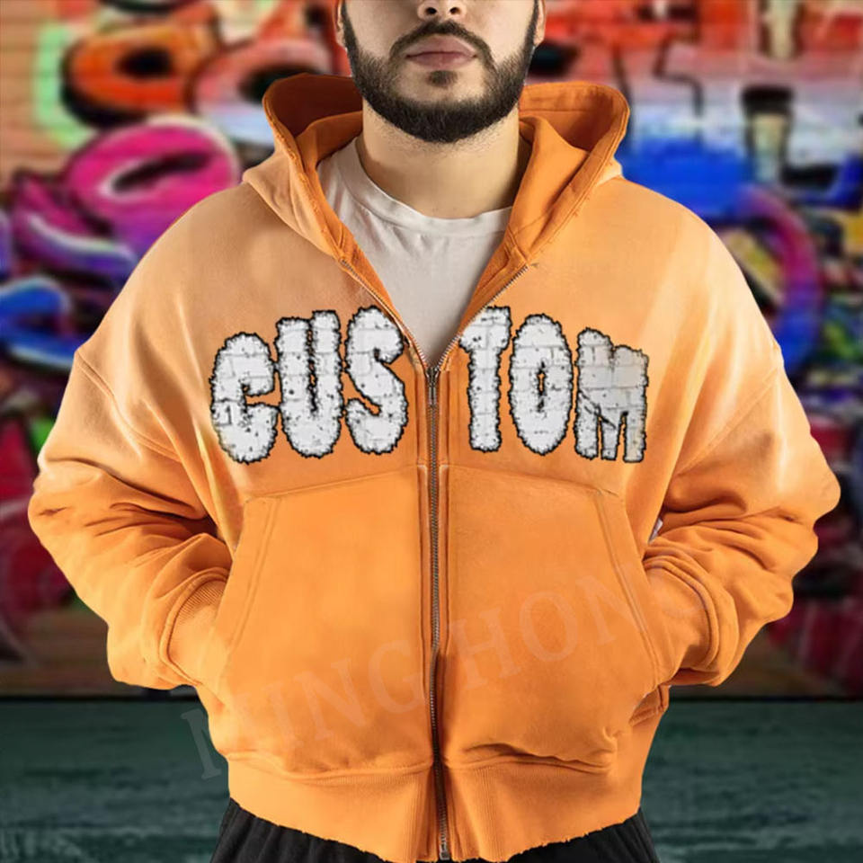 Sweat à capuche délavé vintage à fermeture éclair pour hommes avec impression Dtg Street Graffiti Splash