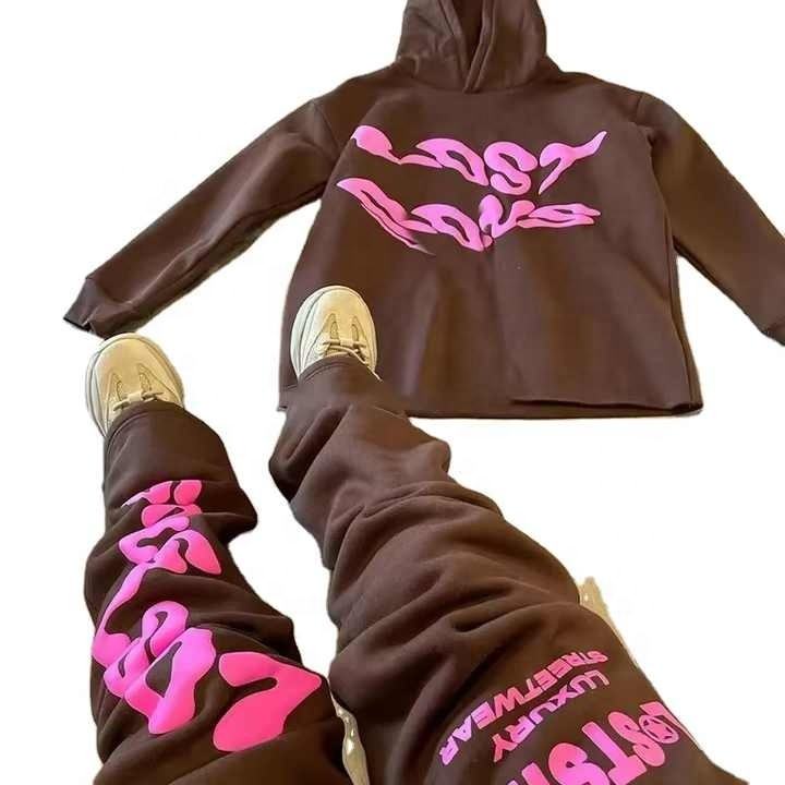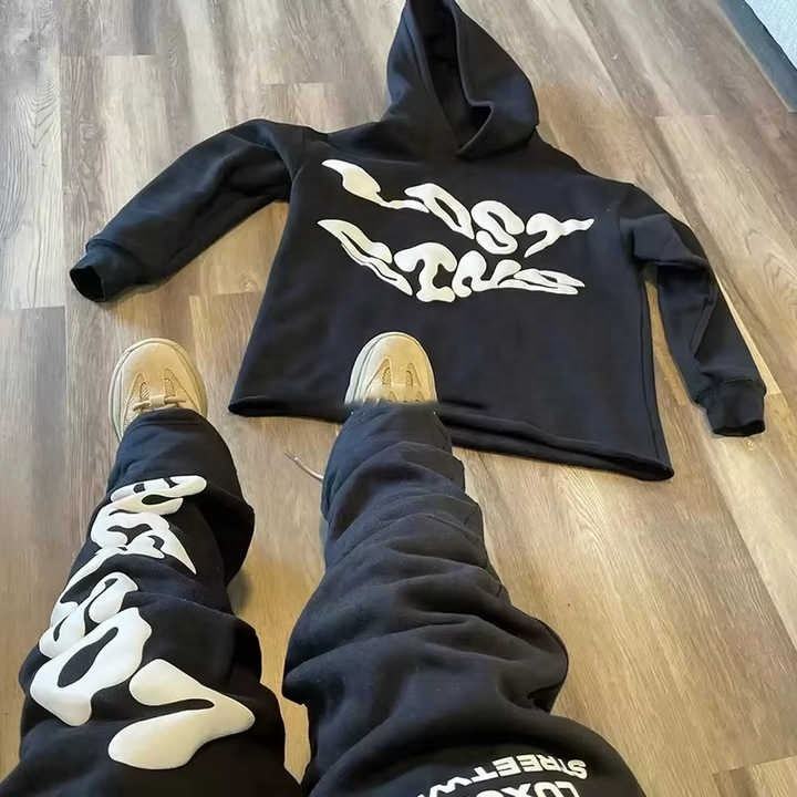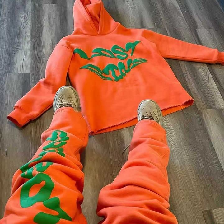Survêtement personnalisé épais 100% coton pour hommes, ensemble de 2 pièces avec impression bouffante, sweat à capuche évasé surdimensionné avec bord à ourlet brut pour la haute