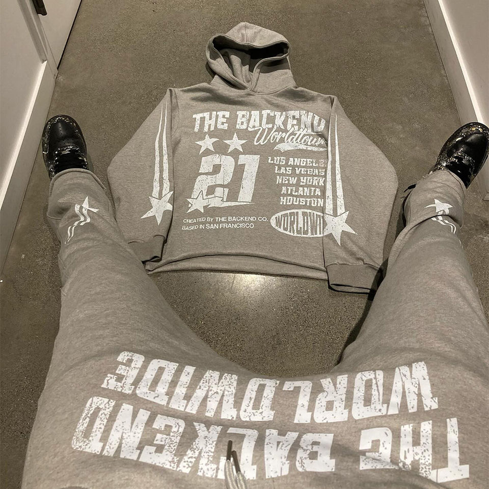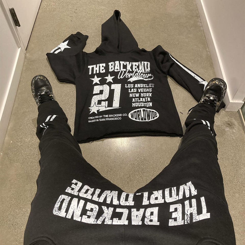 Custom Men's Heavyweight Distressed Acid Washed Winter Tracksuit Cropped Hoodie Raw Hem Flare Sweatpants Rhinestone Solid