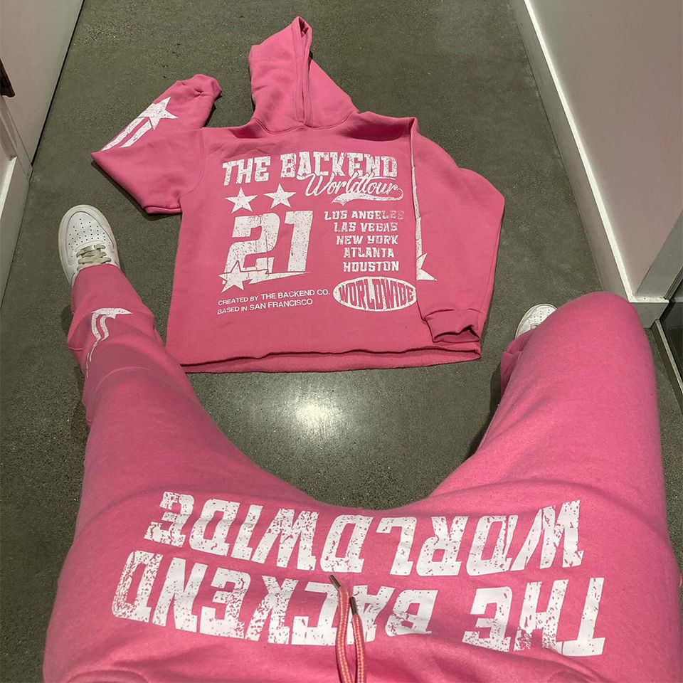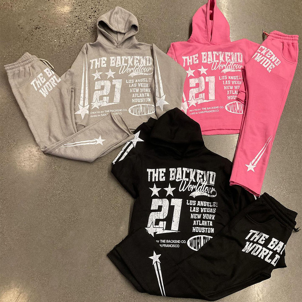 Survêtement d'hiver pour homme personnalisé, lourd, délavé à l'acide, avec sweat-shirt à capuche court, ourlet brut, pantalon de survêtement évasé, strass, uni
