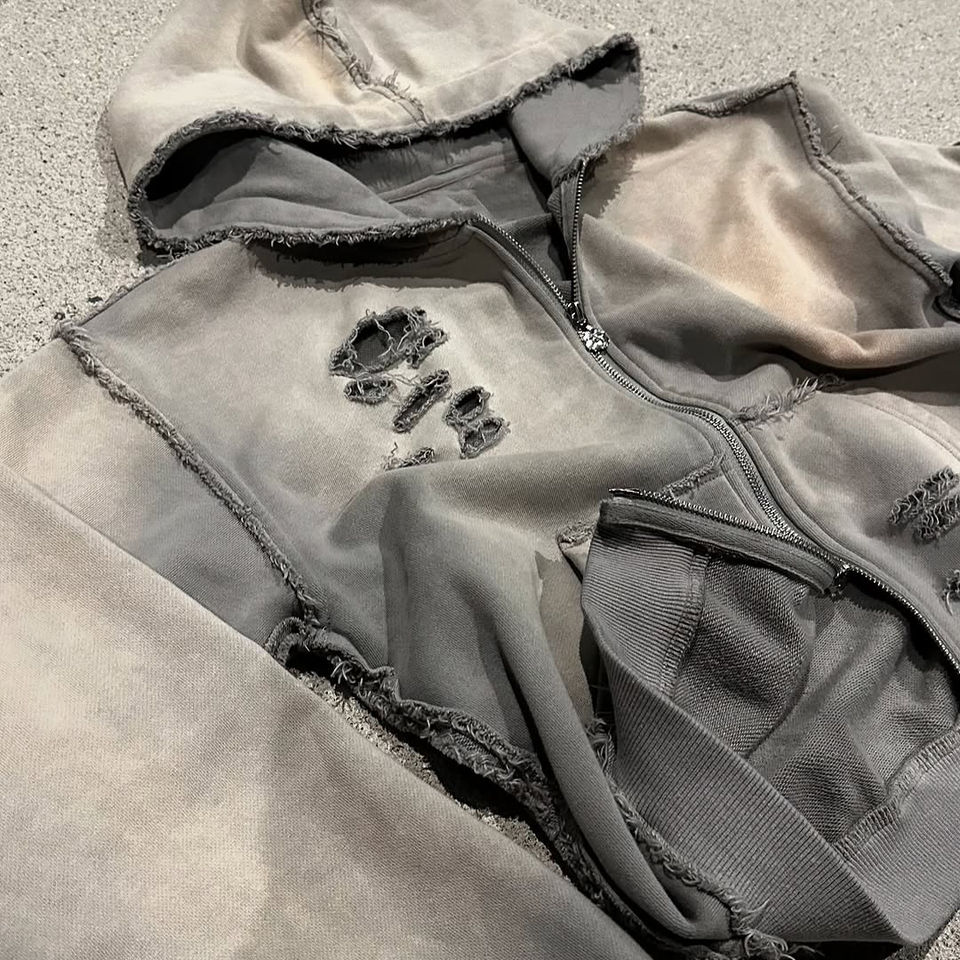 Sweat-shirts surdimensionnés en molleton épais pour homme, lavage à l'acide, double fermeture éclair, strass, déchirés, brodés, streetwear