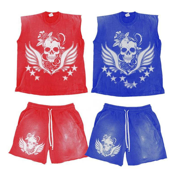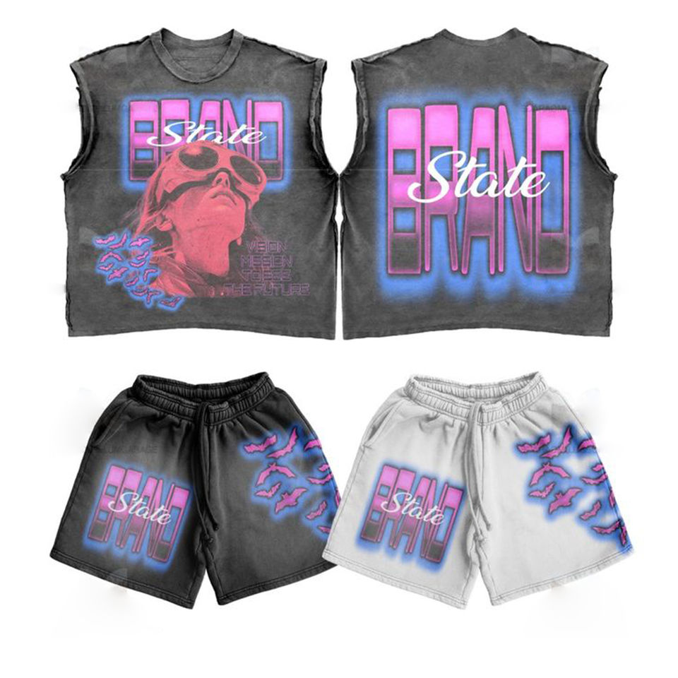 Ensemble streetwear personnalisé pour homme, t-shirt sans manches de haute qualité avec détails de transfert thermique supérieur et short en nylon, tissu 100% coton