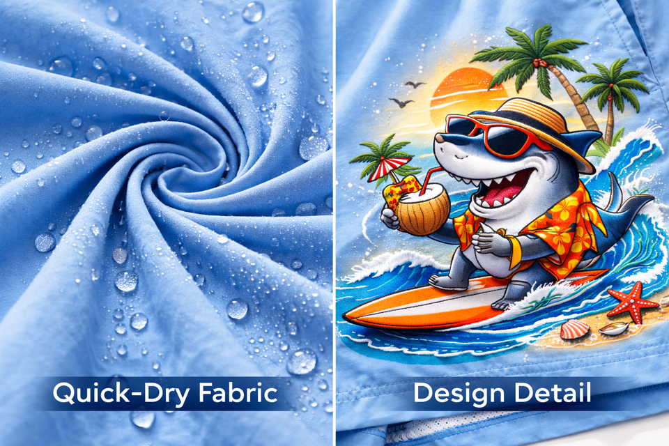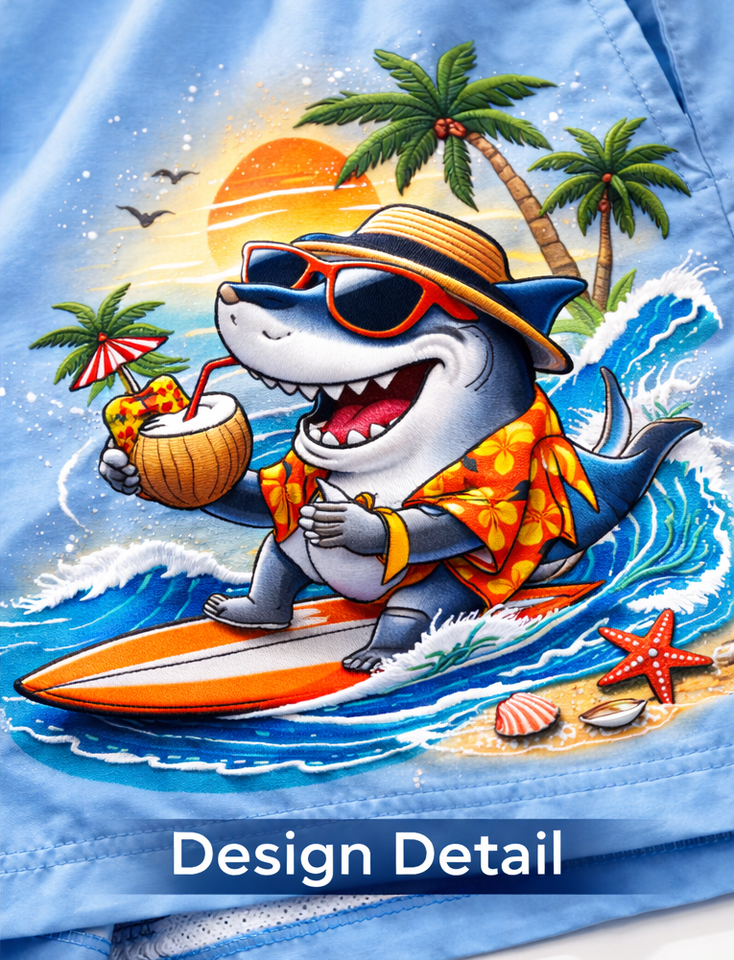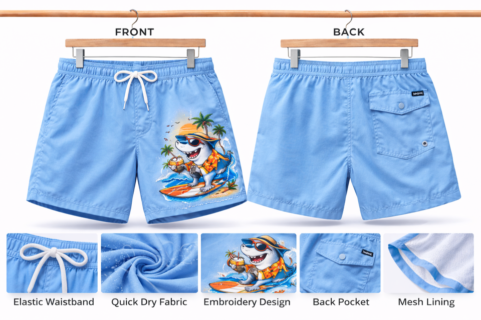 Shorts de plage pour hommes personnalisés à séchage rapide avec imprimé requin de dessin animé – Short de bain à taille élastique – Fabricant OEM en gros
