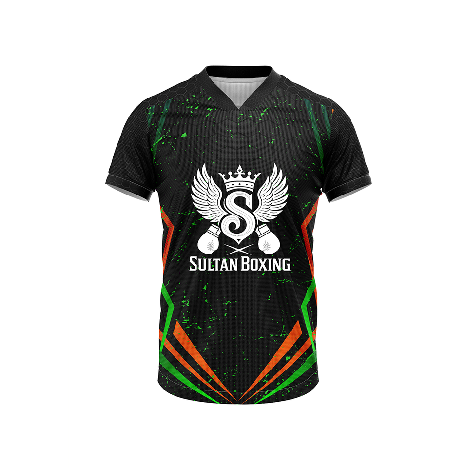 Chemise d'entraînement de boxe en tissu à manches courtes et col en O pour hommes avec logo sur le devant Séchage rapide Respirant-Sultan Boxing