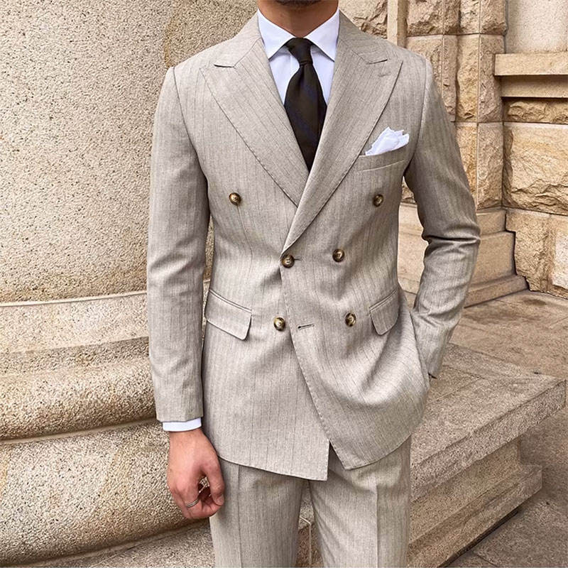 Costume sur mesure pour homme, beige à fines rayures, blazer en polyester à revers large, tenue formelle pour mariages printaniers en plein air et événements de club de campagne