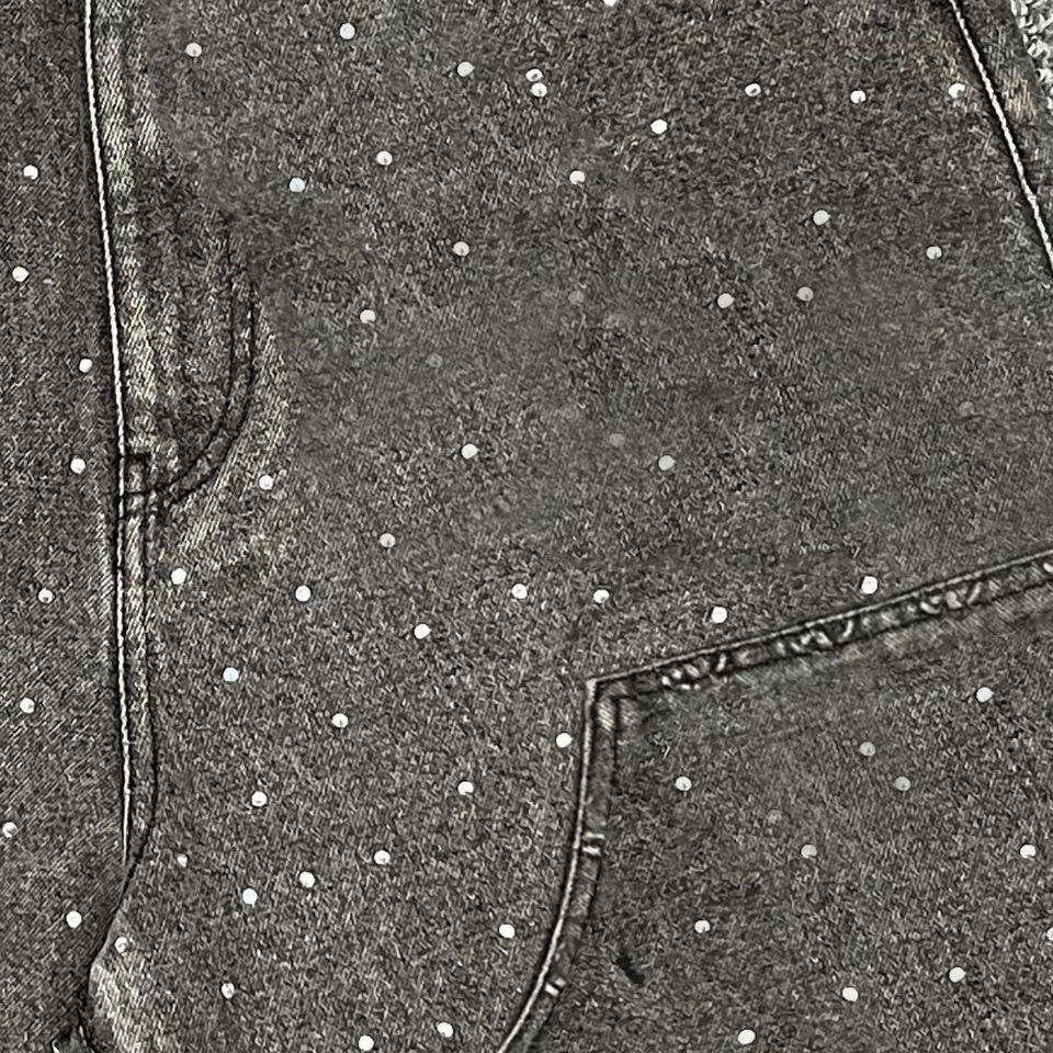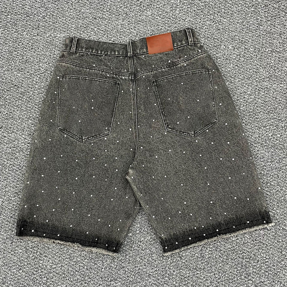 Shorts en jean épais délavés et déchirés pour homme, style vintage, streetwear, jorts tendance avec strass, coupe ample