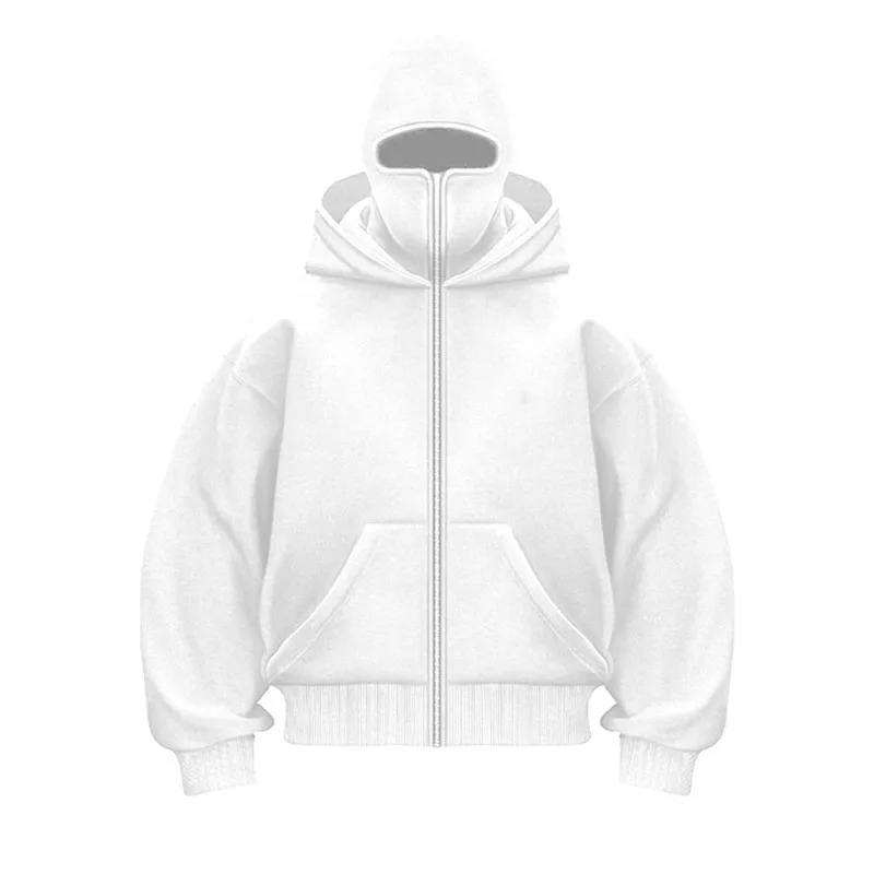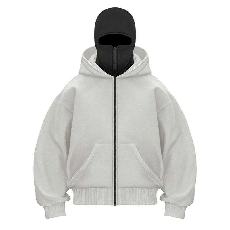 Custom Men's Winter Acid Washed Balaclava Hoodies 100% Cotton Fleece Zip-Up Breathable Thermal Hoodie for Men Double Hood Pocket