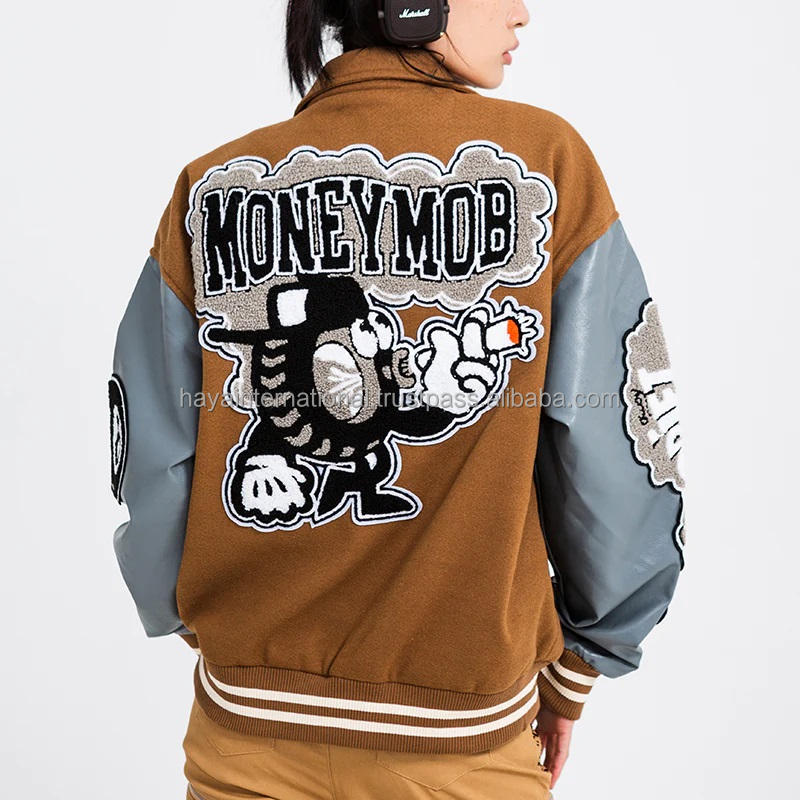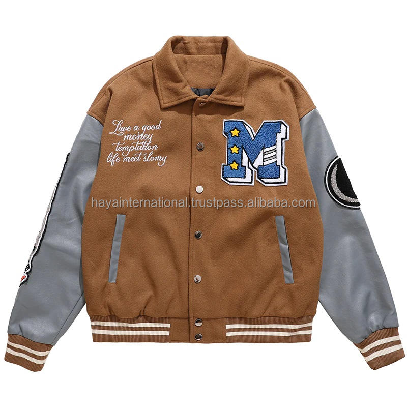 Blouson Bomber d'Hiver Personnalisé pour Homme en Laine Marron/Gris, Écologique, Coupe-Vent, Respirant, en Cuir et Toile Brodé