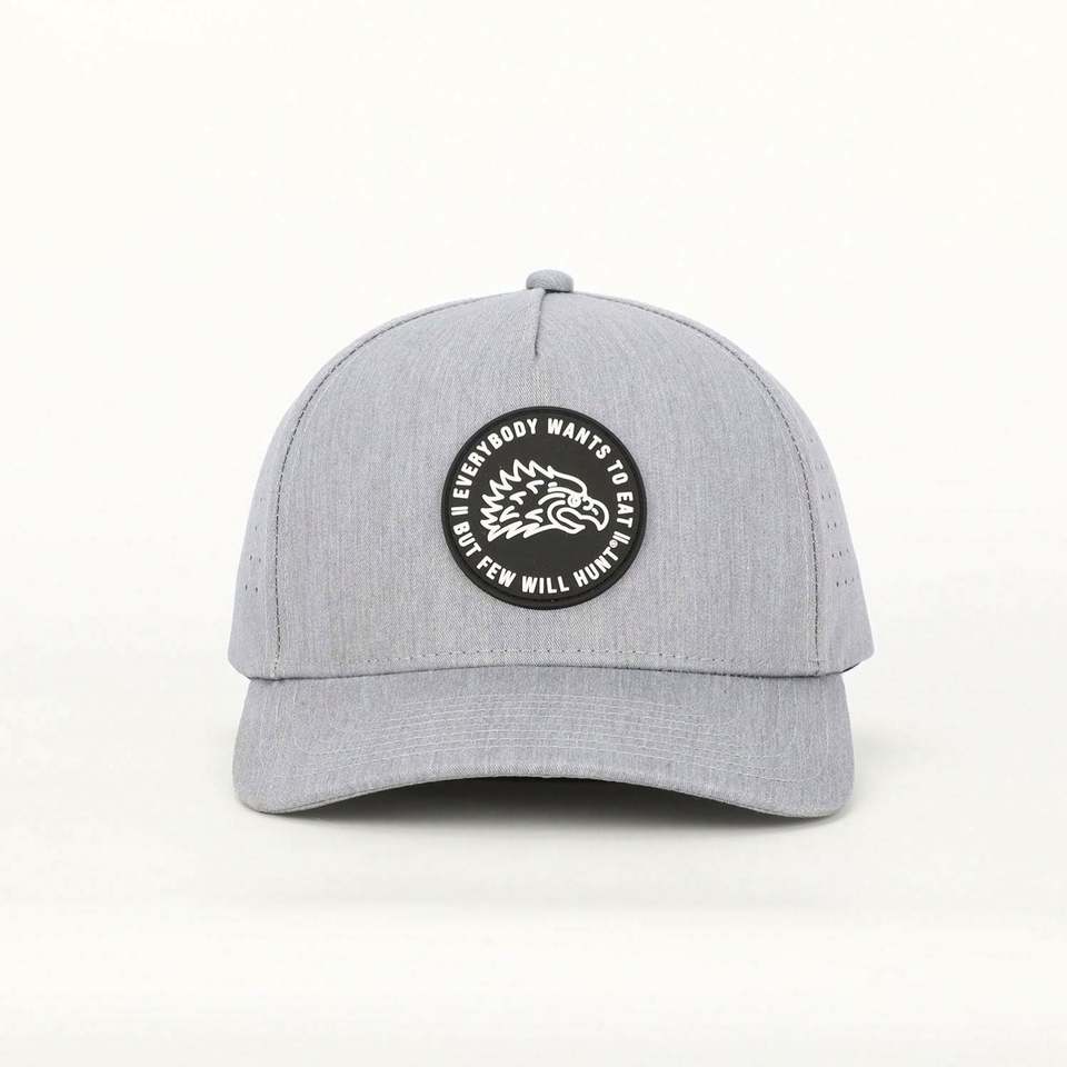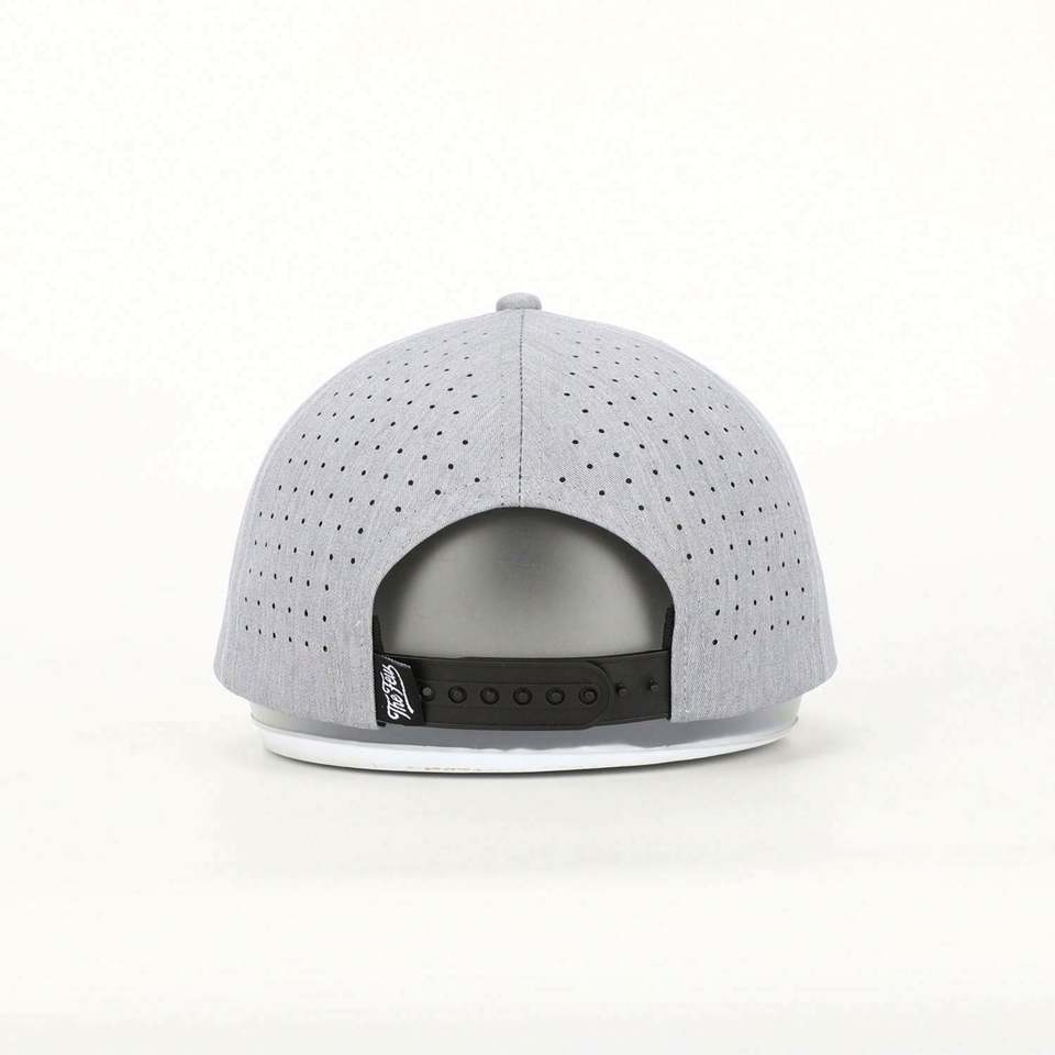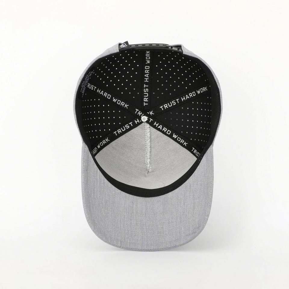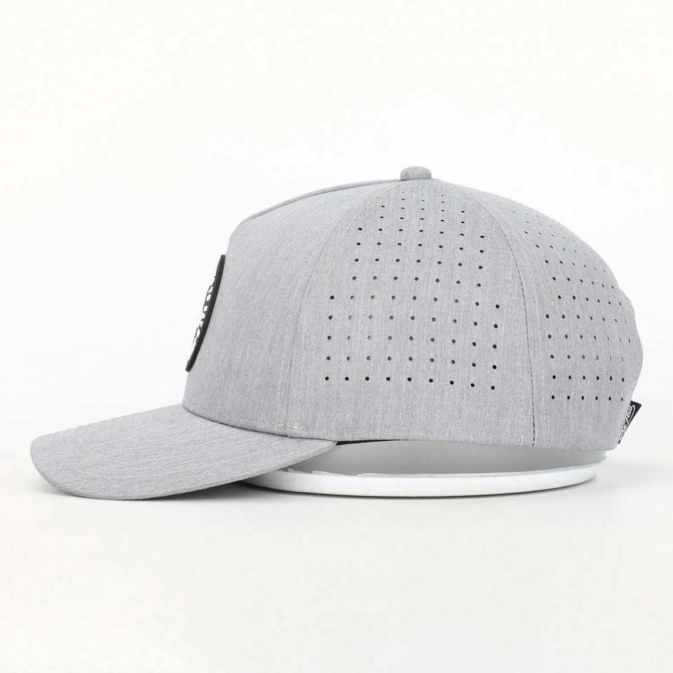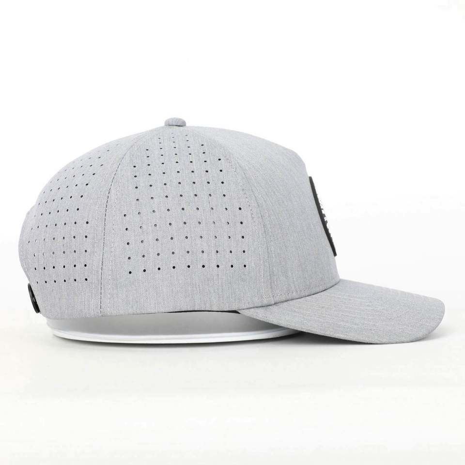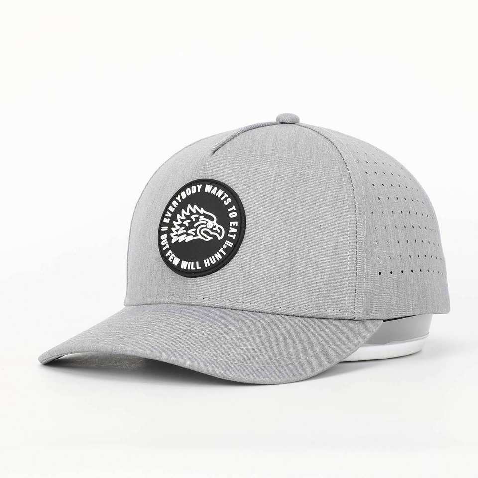 Casquette de baseball personnalisée pour homme, 5 panneaux, gris chiné, perforée au laser, avec logo en patch PVC caoutchouc, imperméable