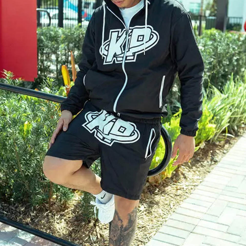 Ensemble survêtement homme personnalisé en polyester et nylon, coupe-vent patchwork color block, veste zippée et short