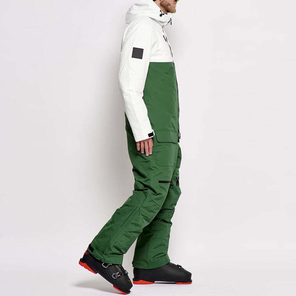 Custom Mens High Quality Waterproof Ski Jumpsuit Green White Panel Design Windproof One Piece Snowboard Wear with Zipper Closure