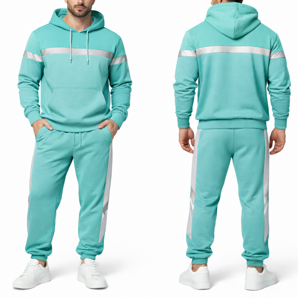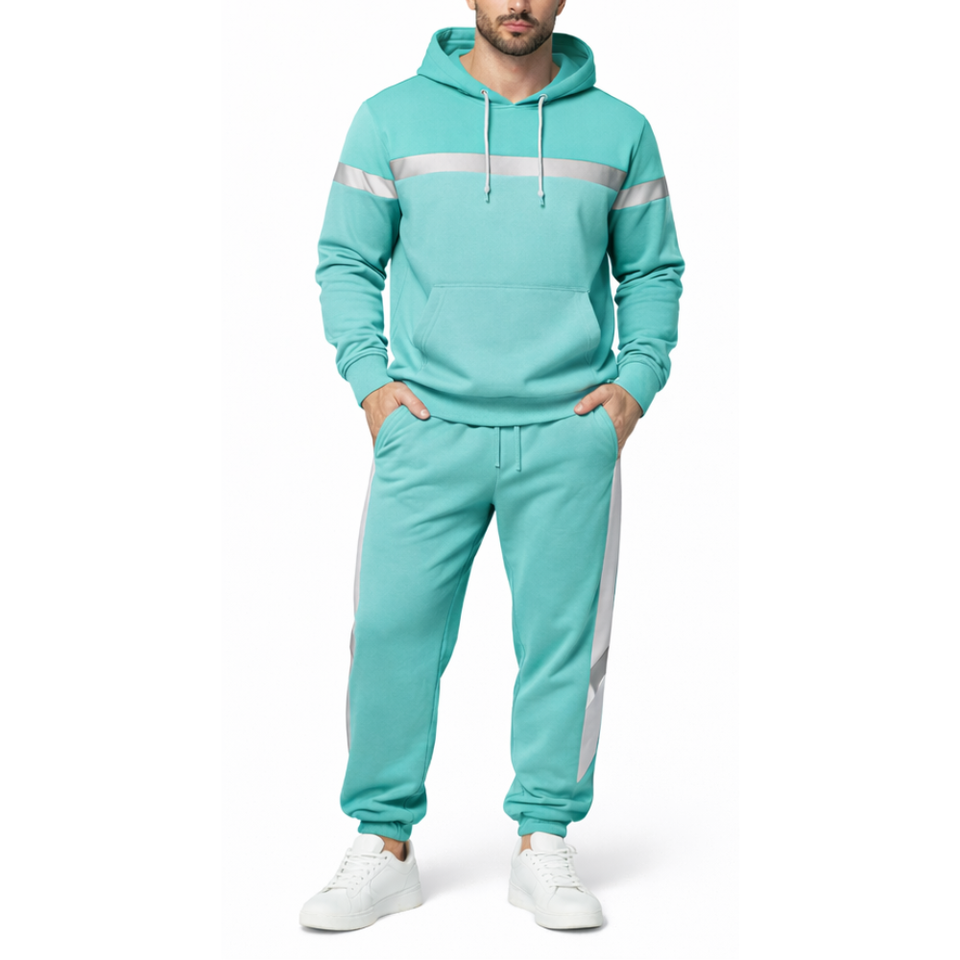 Survêtement homme personnalisé bleu aqua avec bande réfléchissante argentée, ensemble de jogging deux pièces, vêtements de sport OEM