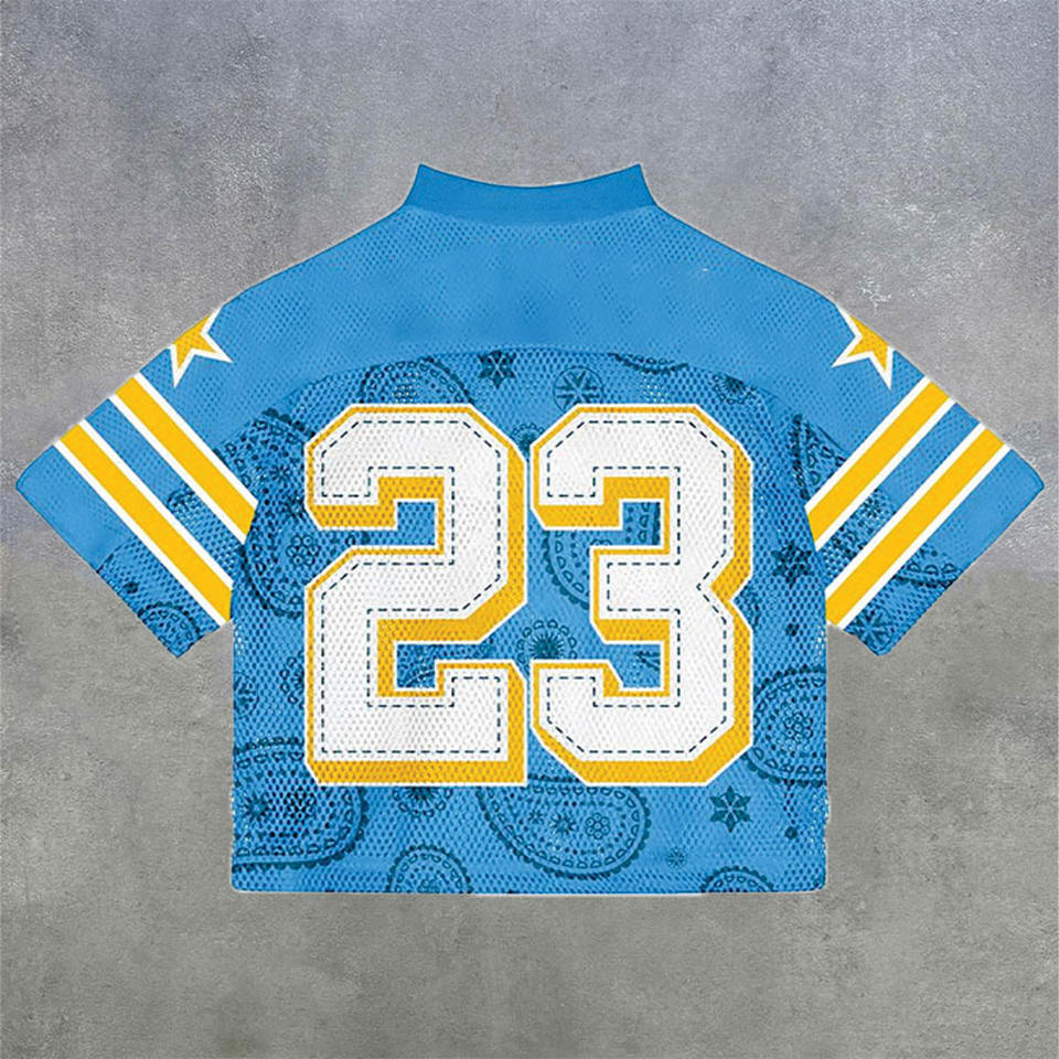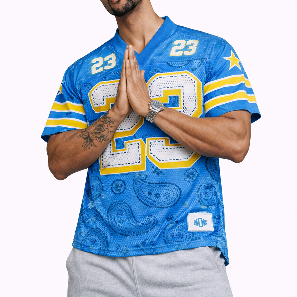Maillot de football américain personnalisé en maille bleue pour hommes, imprimé par sublimation Paisley, uniforme de football respirant, fabrication OEM en gros aux États-Unis
