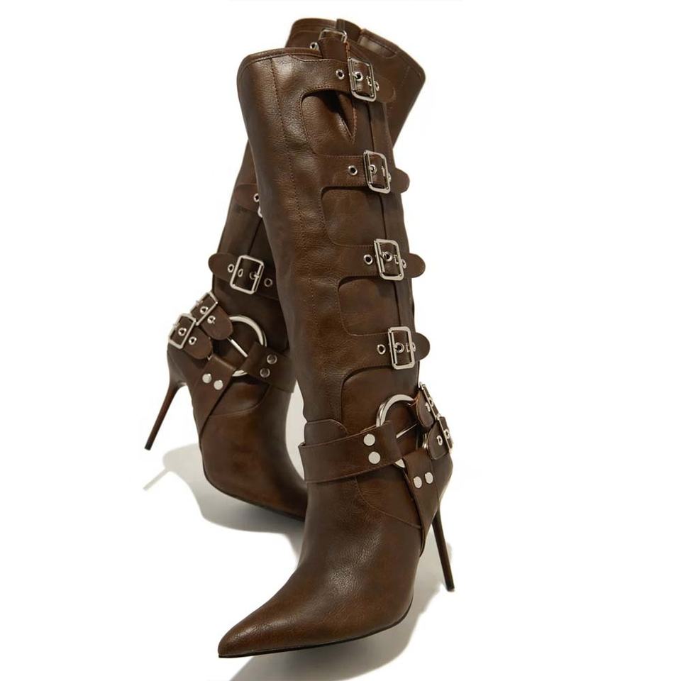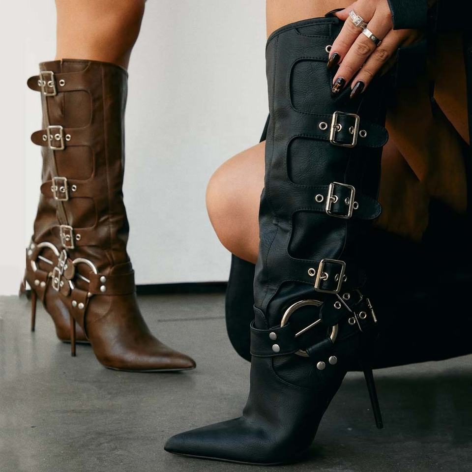 Bottines mi-mollet marron pour femme à talons hauts fins, avec boucles métalliques personnalisées, style western et bout pointu