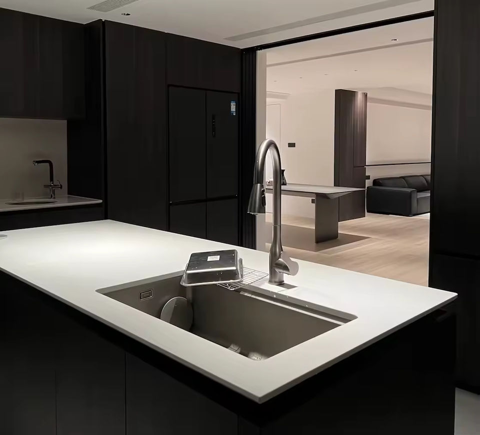 Cuisine moderne minimaliste sur mesure en bois massif avec îlot intégré pour espace de cuisson domestique